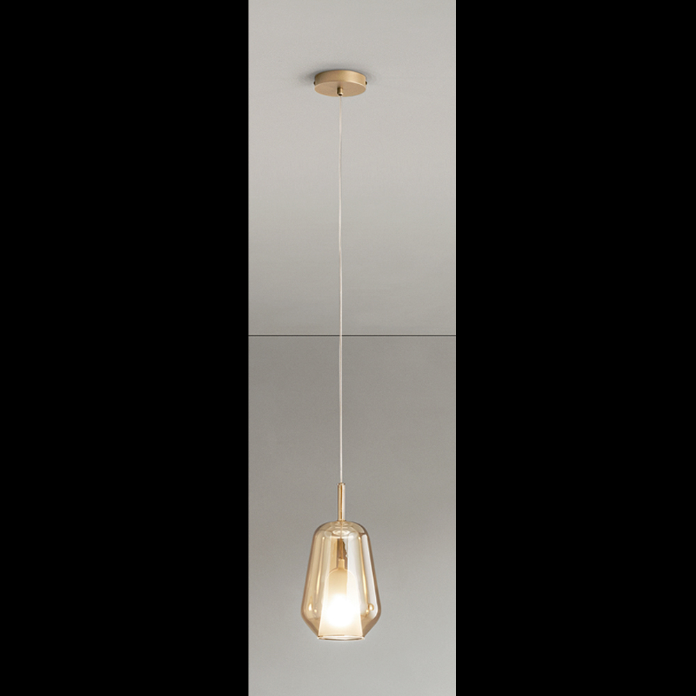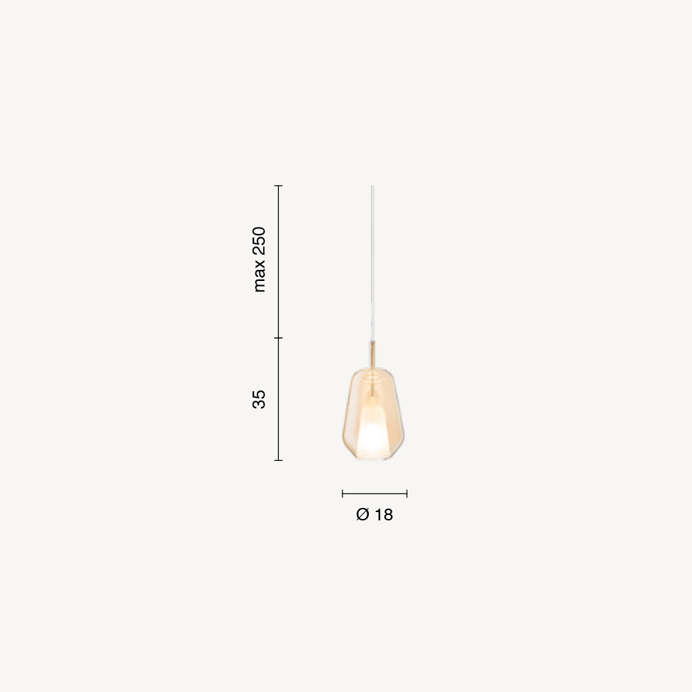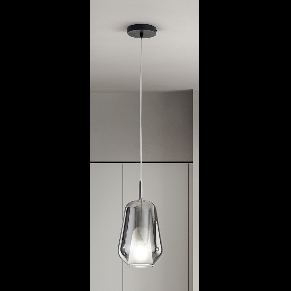 مصباح مصنوع من قاعدة سقف معدنية وموزع زجاجي منفوخ ، يتميز بطبقتين: داخلية من زجاج ساتان وخارجية من زجاج ملون . غطاء من مادة بوليمرية لتثبيت الكابل في موضع مركزي. كابل قابل للتعديل.