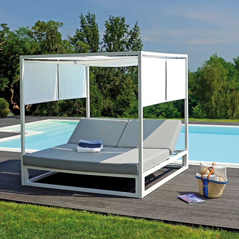 سرير نهاري خارجي بهيكل من الألومنيوم باللون الأبيض ومسند ظهر مزدوج قابل للإمالة.