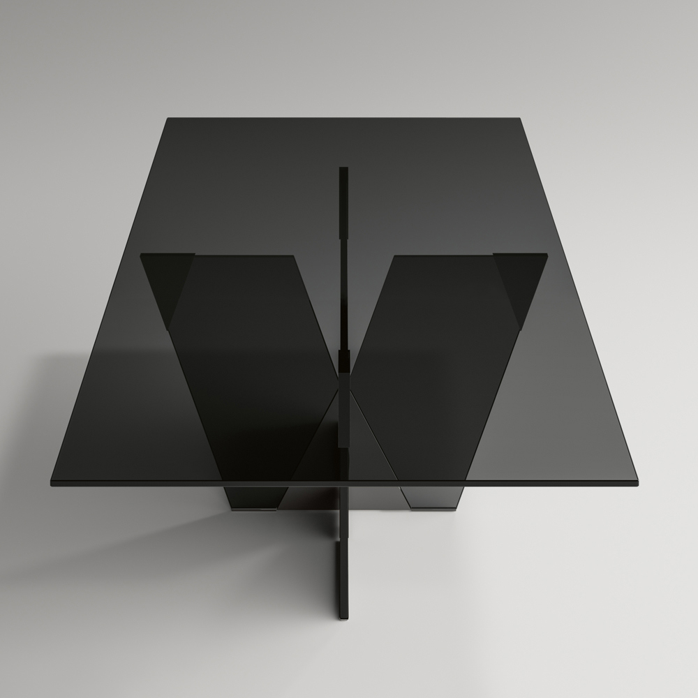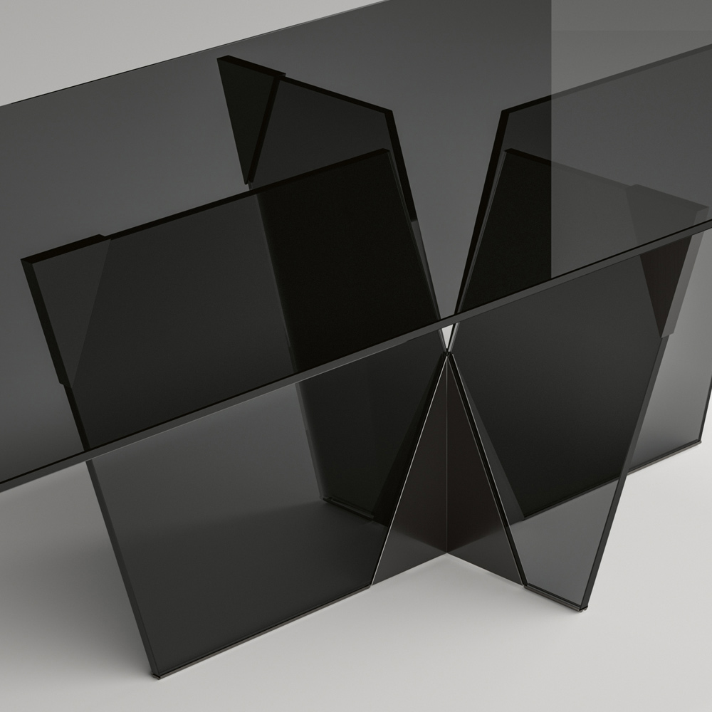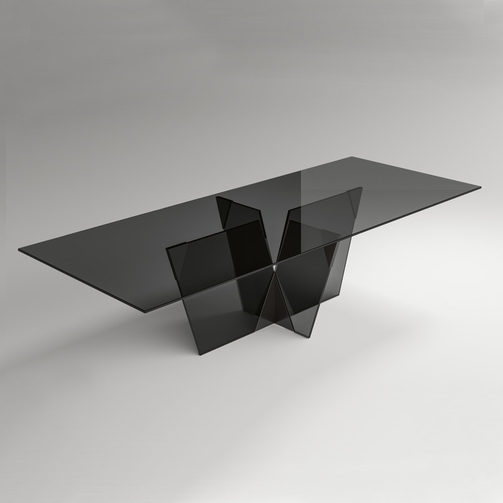 طاولة طعام بسطح مستطيل وقاعدة زجاجية ، مصنوعة بالكامل في إيطاليا . تتميز هذه القطعة بتصميمها الأنيق والنحتي ، وهي ثمرة مزيج من مواد متنوعة، إلى جانب شغفها بمعالجة الزجاج، مما يُجسّد القوة والشخصية من خلال أشكالها وسماكاتها المتنوعة. تكمن نقطة القوة الجمالية في قاعدتها المعمارية، التي تتميز بمفصل هرمي مصنوع من المعدن، وهو الجزء الأساسي من المنتج. تُكمل العناصر المعدنية تصميم الطاولة، مانحةً إياها شكلًا مميزًا لزجاج القاعدة، ومُضفيةً عليه طابعًا مميزًا وأصالة.