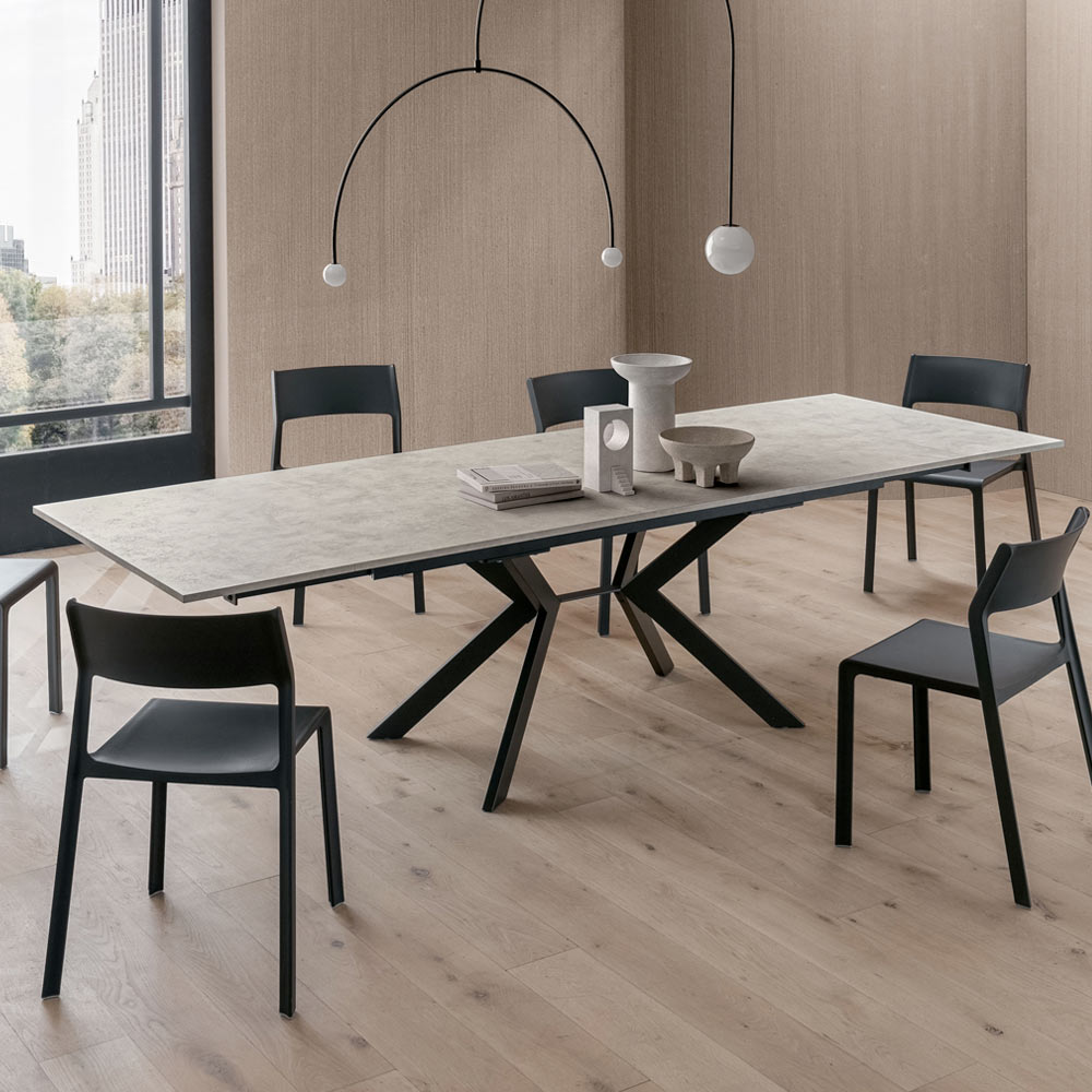 طاولة داخلية مصنوعة من سطح HPL وقاعدة معدنية على شكل حرف "K" مطلية ببودرة إيبوكسي. الطاولة قابلة للتمديد بدليل من الألومنيوم مع فتحات جانبية للامتدادات الملحقة به.