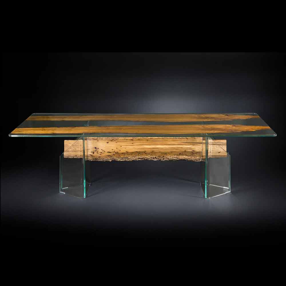 طاولة مستطيلة فينيسيا، مصنوعة من خشب بريكولا البندقية والزجاج، بتصميم عصري. فينيسيا طاولة فريدة واستثنائية، تُجسّد تاريخ البندقية. صُنعت فينيسيا من خشب البريكولا: "البريكولا" هي الأعمدة التي كانت قائمة في بحيرة مدينة البندقية منذ القدم، لإرشاد القوارب وتنبيه الزوار. سطح الطاولة مصنوع من طبقتين من الزجاج (10 مم + 10 مم). بين الطبقتين، توجد طبقة رقيقة من خشب البريكولا القديم. أما أرجل الطاولة، فهي مصنوعة من زجاج مُقوّس. هذه الطاولة مصنوعة 100٪ في إيطاليا.