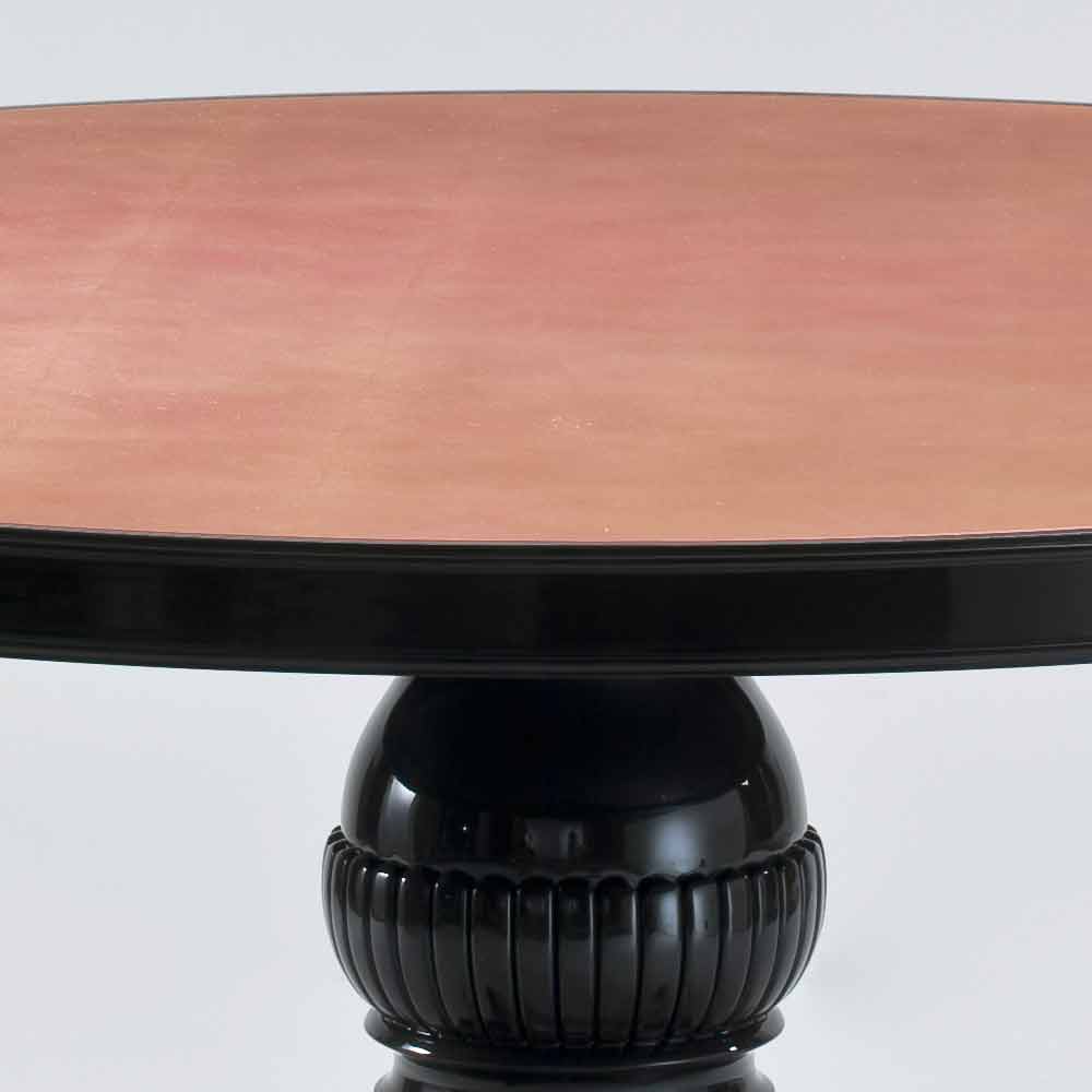 طاولة مستديرة بتصميم كلاسيكي من خشب الماهوجني المصقول، قطرها 150 سم، أكيم طاولة مستديرة بقاعدة مركزية وأطراف نحاسية. لمسة نهائية من خشب الماهوجني الطبيعي المصقول.