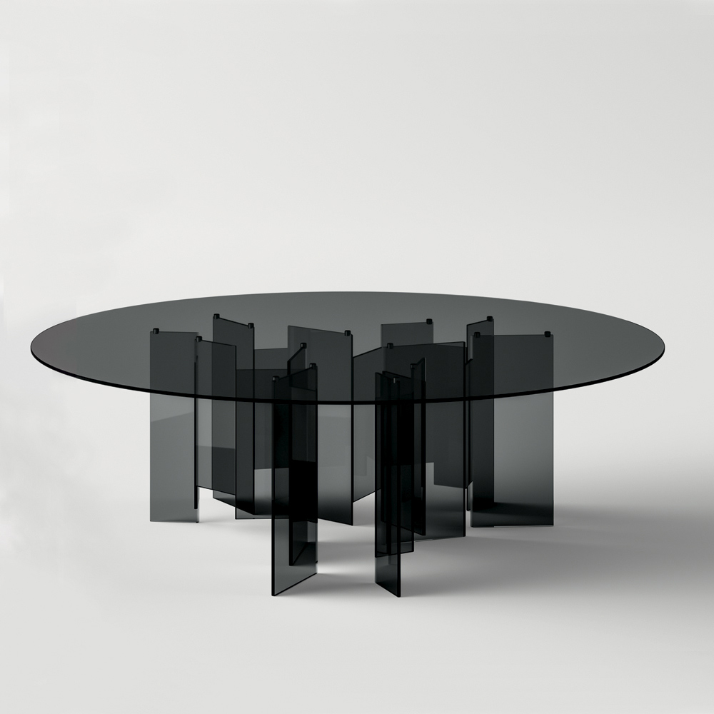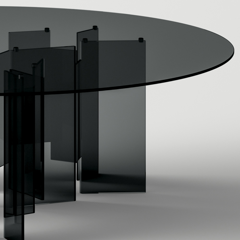 طاولة طعام مصنوعة بالكامل من الزجاج مع أساس الأشكال تصميم هندسي يدعم سطحًا دائريًا أنيقًا. حلٌّ أثاثيٌّ مُصمَّمٌ بعناية فائقة، مُصنَّع في إيطاليا، من خلال معالجةٍ احترافيةٍ للزجاج على يد حرفيين مهرة ، يُضفون على هذا المزيج المثالي بين الجودة والتصميم والوظائف العملية .