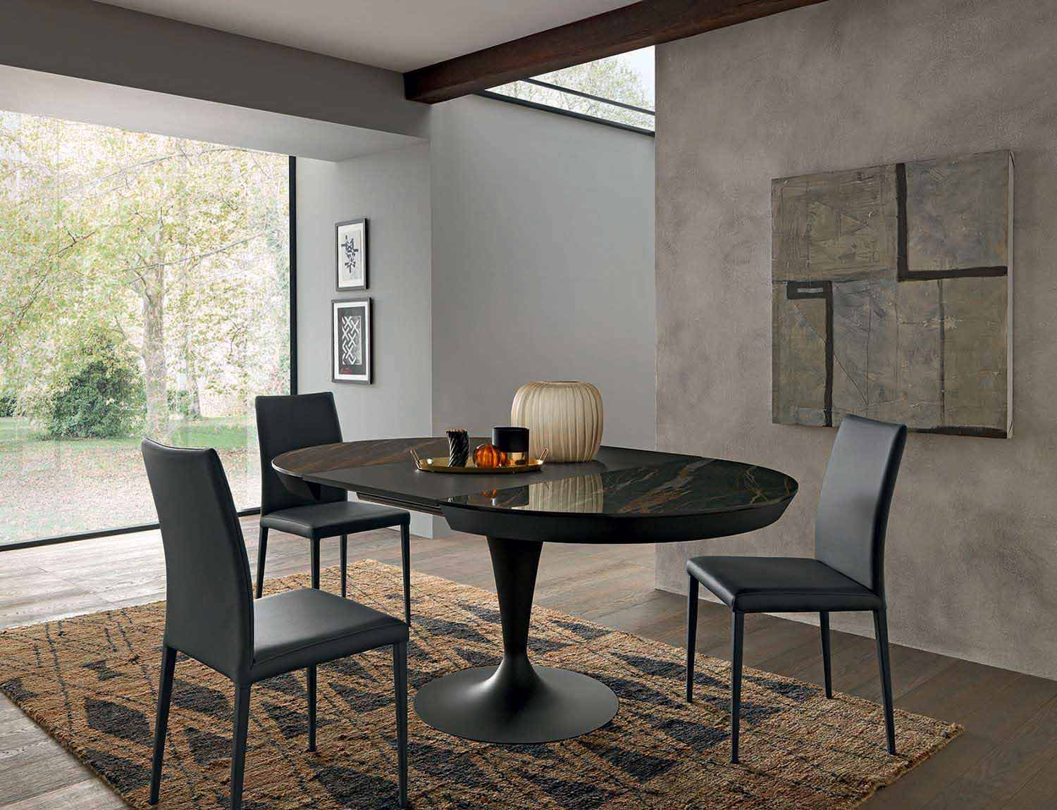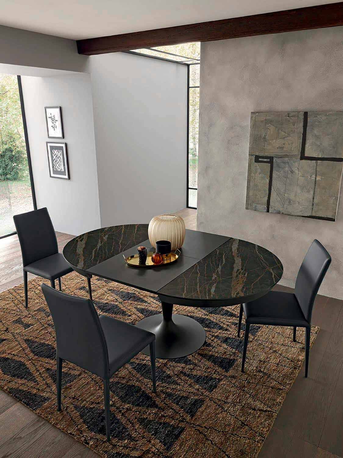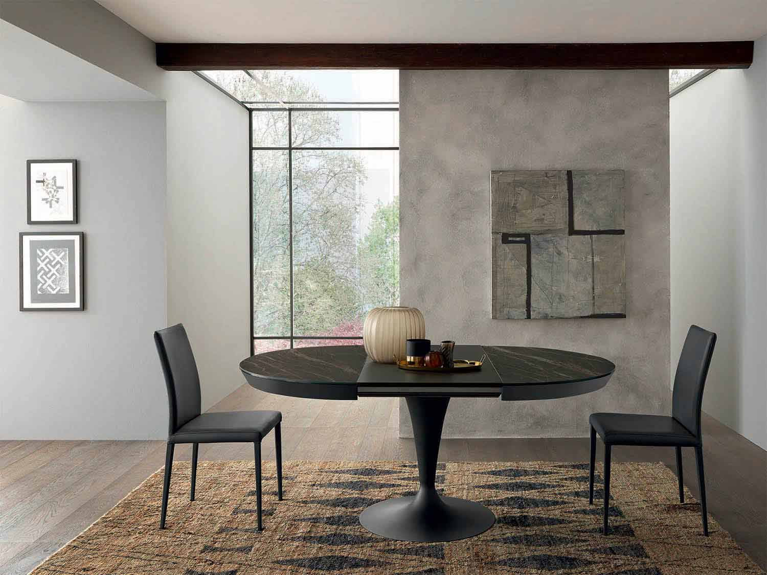طاولة طعام بتصميم قابل للتمديد مع سطح دائري من السيراميك اللامائي وقاعدة معدنية صنع في إيطاليا.