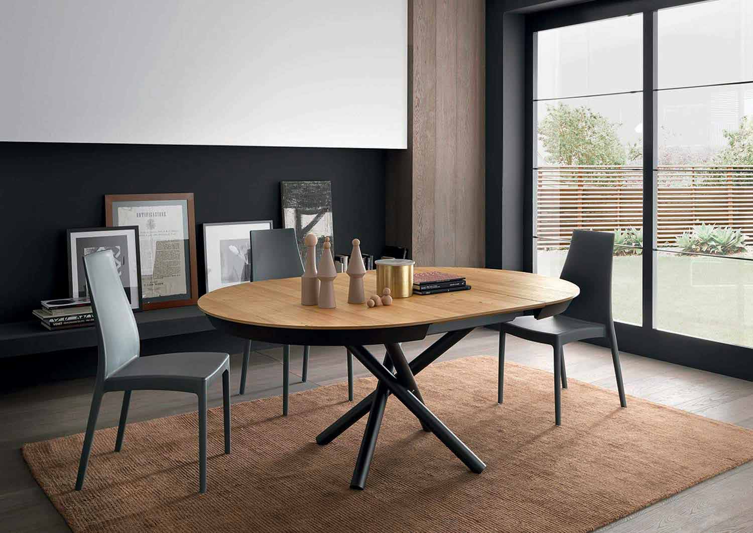 طاولة طعام دائرية قابلة للتمديد مع سطح خشبي وقاعدة معدنية صنع في إيطاليا.