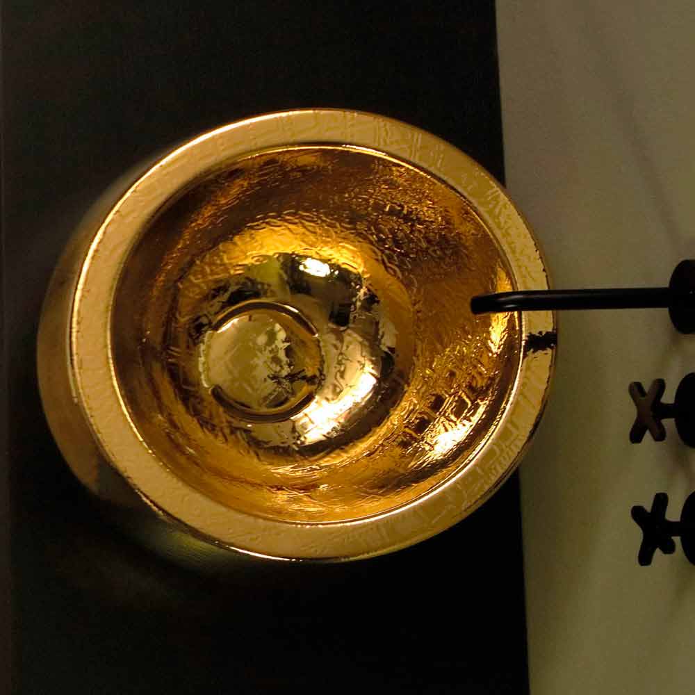 حوض غسيل دائري بتصميم سطح الطاولة مصنوع من سيراميك إليزا الذهبي، صنع في إيطاليا تحتوي إليزا على ذكريات ونكهات من أفريقيا، مع شكل دائري وحافة بارزة مهمة. يسمح القطع المزدوج للصرف بالتدفق المستمر للمياه.