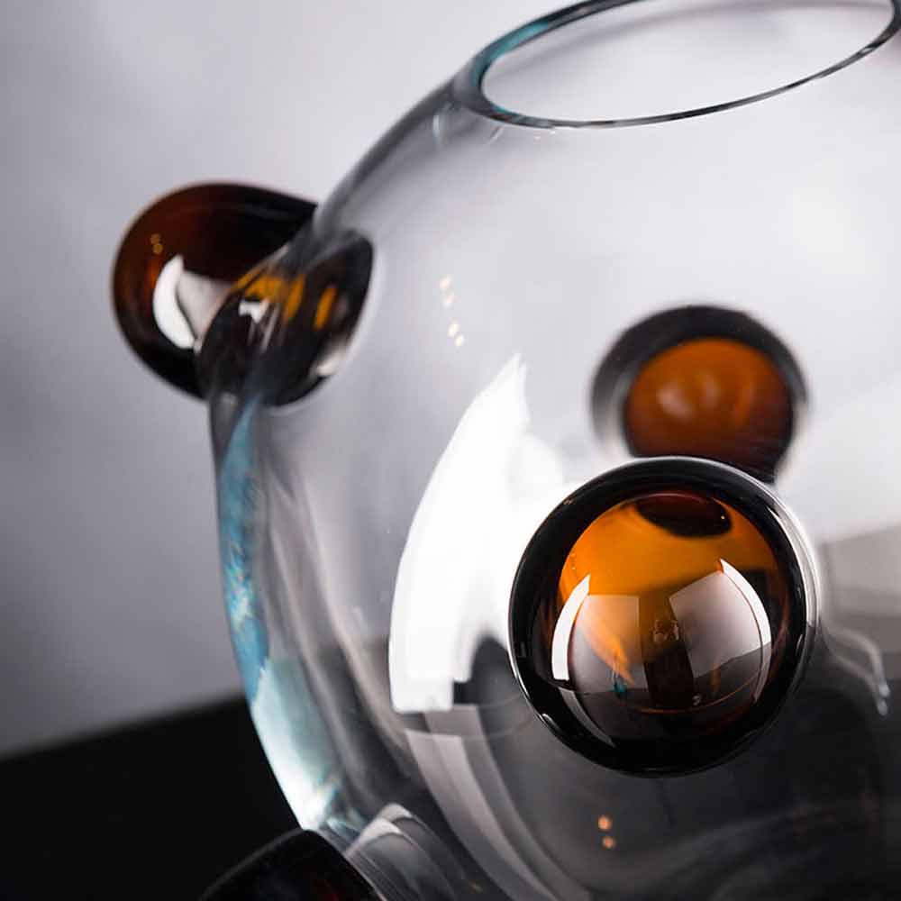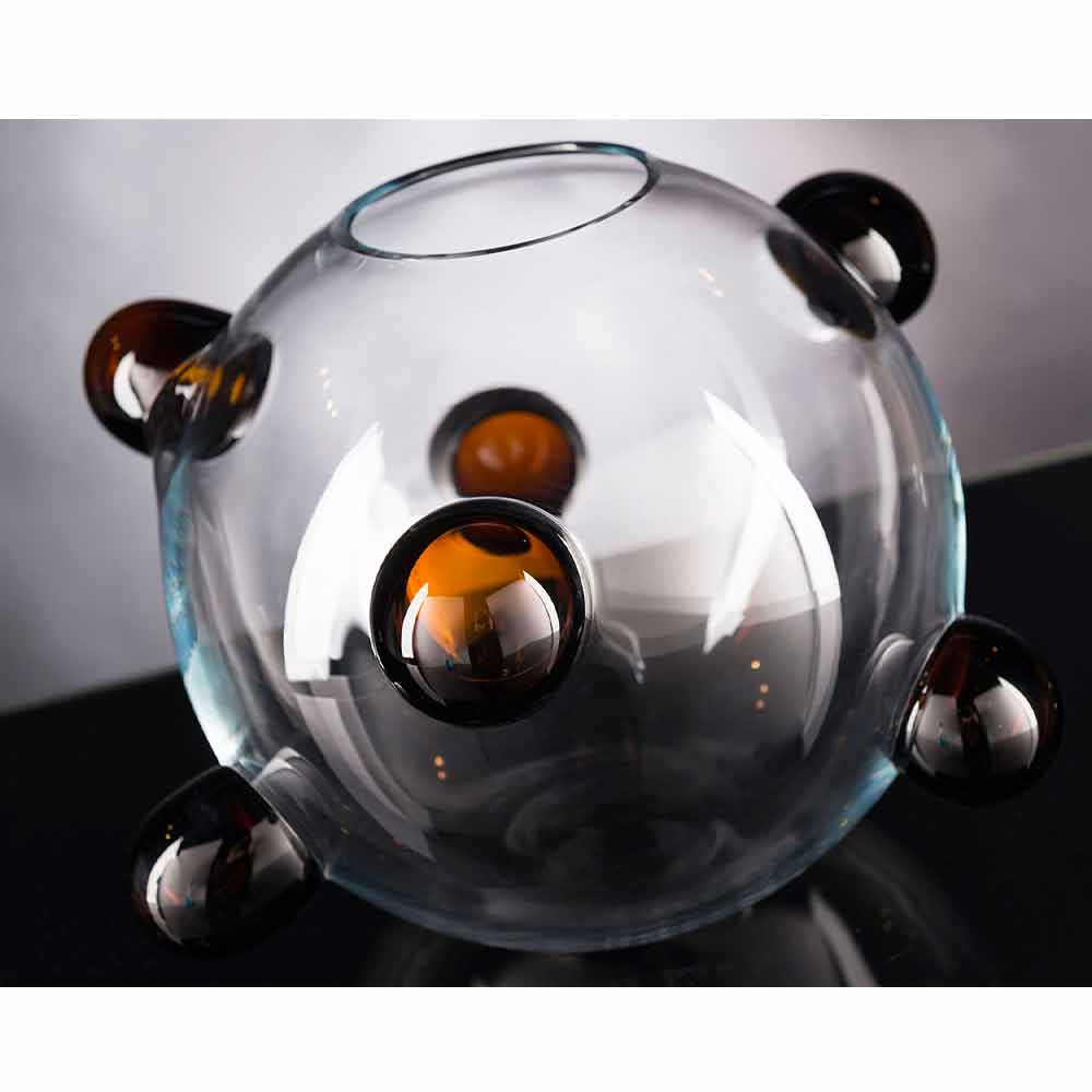 مزهرية ديكورية داخلية كروية الشكل من زجاج مورانو الشفاف المنفوخ بتفاصيل ملونة، مصنوعة بالكامل في إيطاليا . فكرة تأثيث مبتكرة تُجسّد خصائص زجاج مورانو، وتصميمًا ثوريًا يتميز بلمسات لونية حصرية ورائدة ، لنتيجة نابضة بالحياة ذات تأثير سينيوغرافي قوي . تصميم مثالي لمختلف البيئات، من أثاث المنزل إلى الفنادق والمطاعم ومناطق التعاقد والمنتجعات الصحية، بالإضافة إلى أماكن لإقامة الفعاليات وحفلات الزفاف.