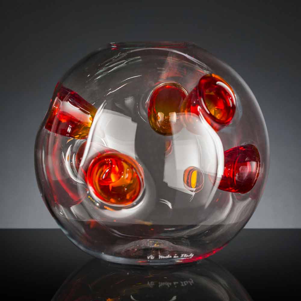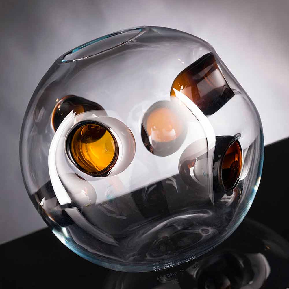 مزهرية داخلية عصرية كروية الشكل من زجاج مورانو الشفاف المنفوخ بتفاصيل ملونة، مصنوعة بالكامل في إيطاليا . تصميم يجمع بين خصائص وقيمة زجاج مورانو مع إبداع وأصالة أسلوب عصري يتميز بلمسات لونية فريدة وريادية، لينتج نتيجة فريدة تُثري أي أجواء أسلوبية، مُحققةً تناغمًا مثاليًا . تصميم مثالي لمختلف البيئات، من أثاث المنزل إلى الفنادق والمطاعم ومناطق التعاقد والمنتجعات الصحية، بالإضافة إلى أماكن لإقامة الفعاليات وحفلات الزفاف.
