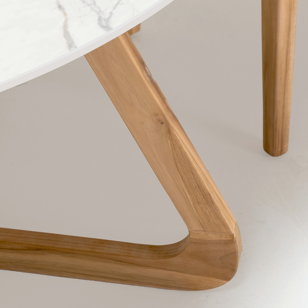 القاعدة الخشبية لا تدعم سطح الطاولة الخزفي المتين فحسب، بل تضفي عليه لمسةً من الدفء الطبيعي، ما يخلق تباينًا بصريًا آسرًا مع سطح الرخام اللامع. هذا المزيج ليس جميلًا من الناحية الجمالية فحسب، بل يوفر أيضًا المتانة ومقاومةً للعوامل الجوية ، مما يجعل الطاولة مثاليةً للاستخدام اليومي في الهواء الطلق.