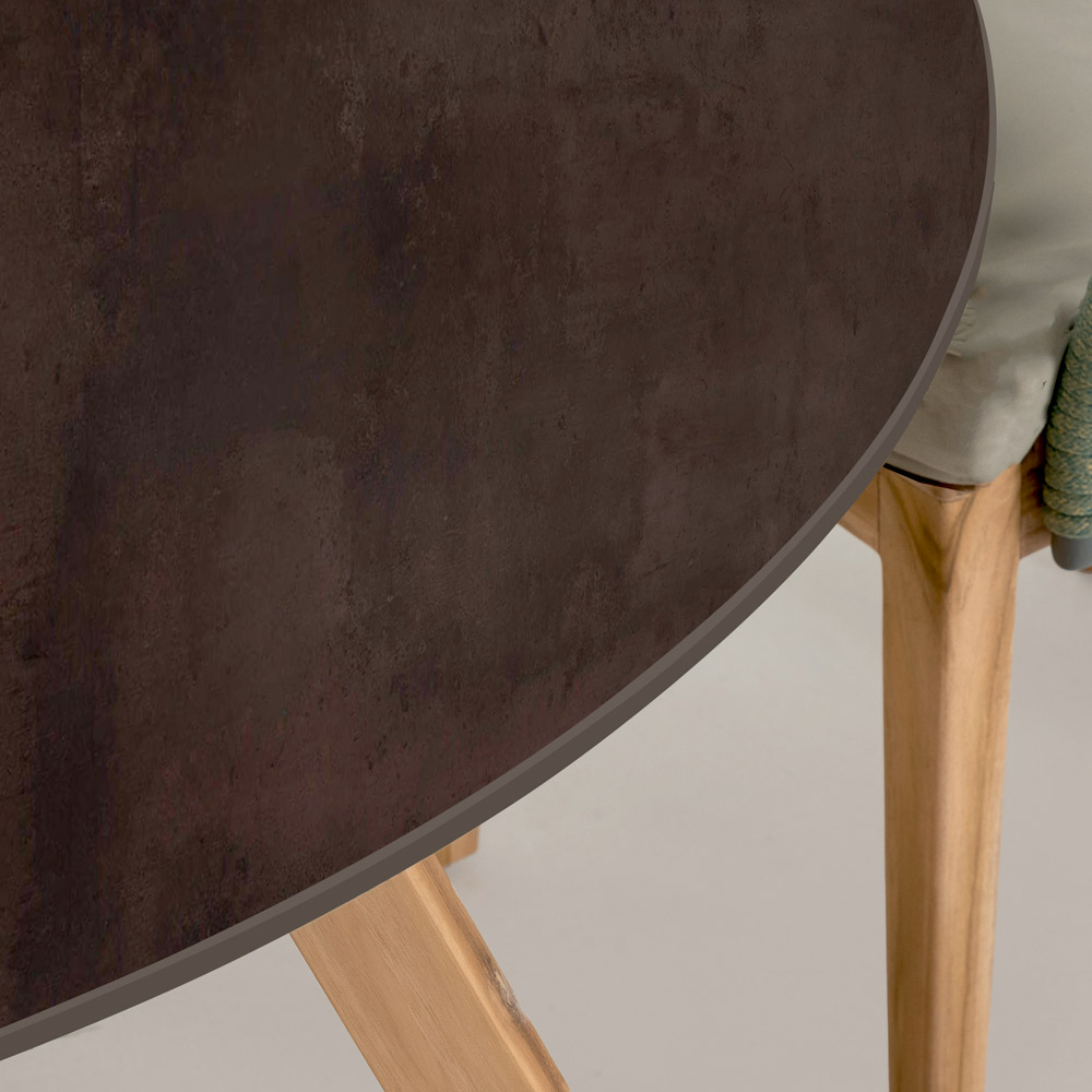 صنع بالكامل في إيطاليا. هذه الطاولة الخارجية قطعة فنية مستوحاة من الجمالية الصناعية والسحر الريفي لسيراميك كورتن المعدني. تجمع بين قاعدة خشبية وسطح سيراميكي يحاكي لون وملمس معدن كورتن، المعروف بمظهره الصدئ المميز الذي يمتزج ببراعة مع الأجواء الخارجية الطبيعية والعصرية.