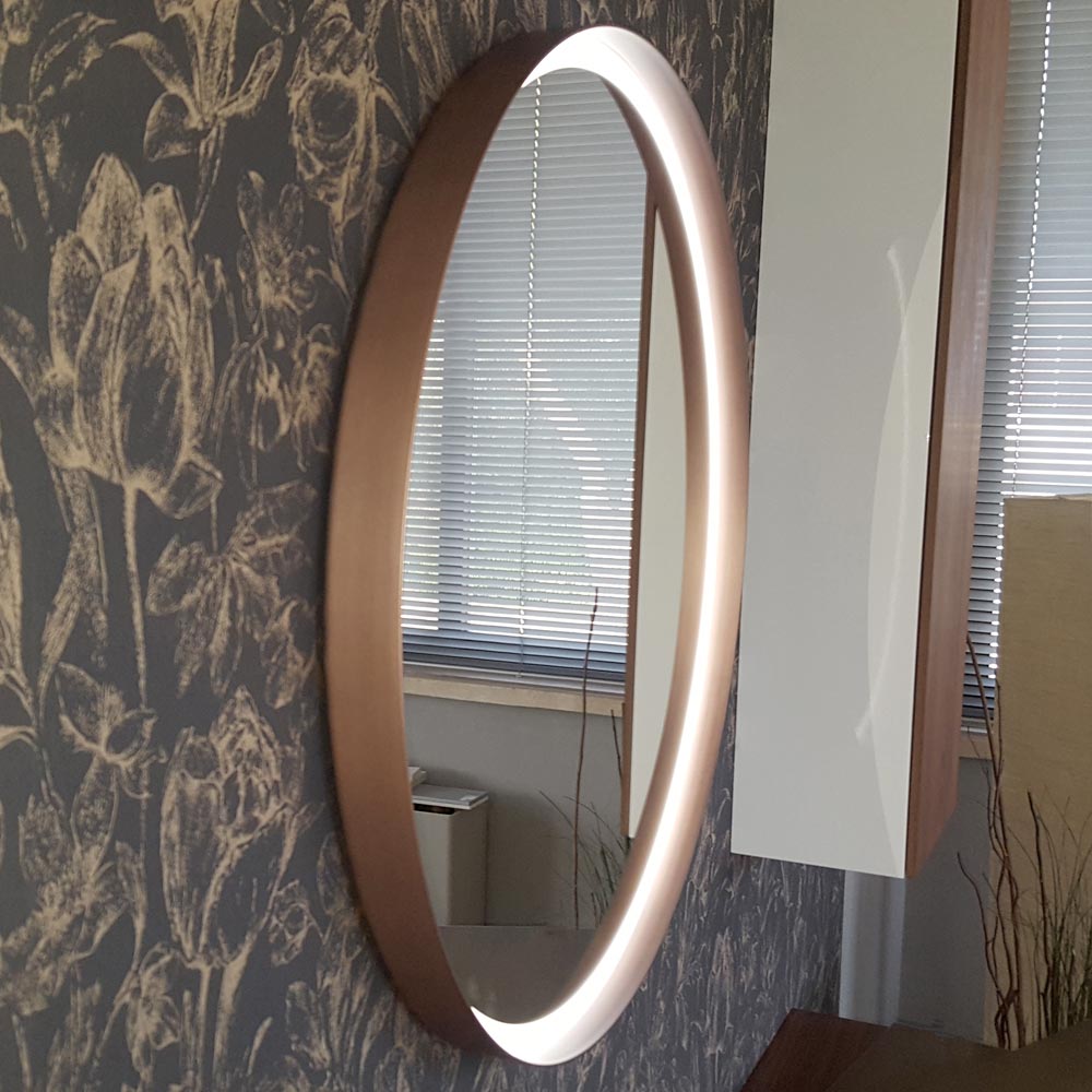مرآة حائط دائرية بإطار معدني بأربعة أشكال وإضاءة LED، صنعت في إيطاليا.