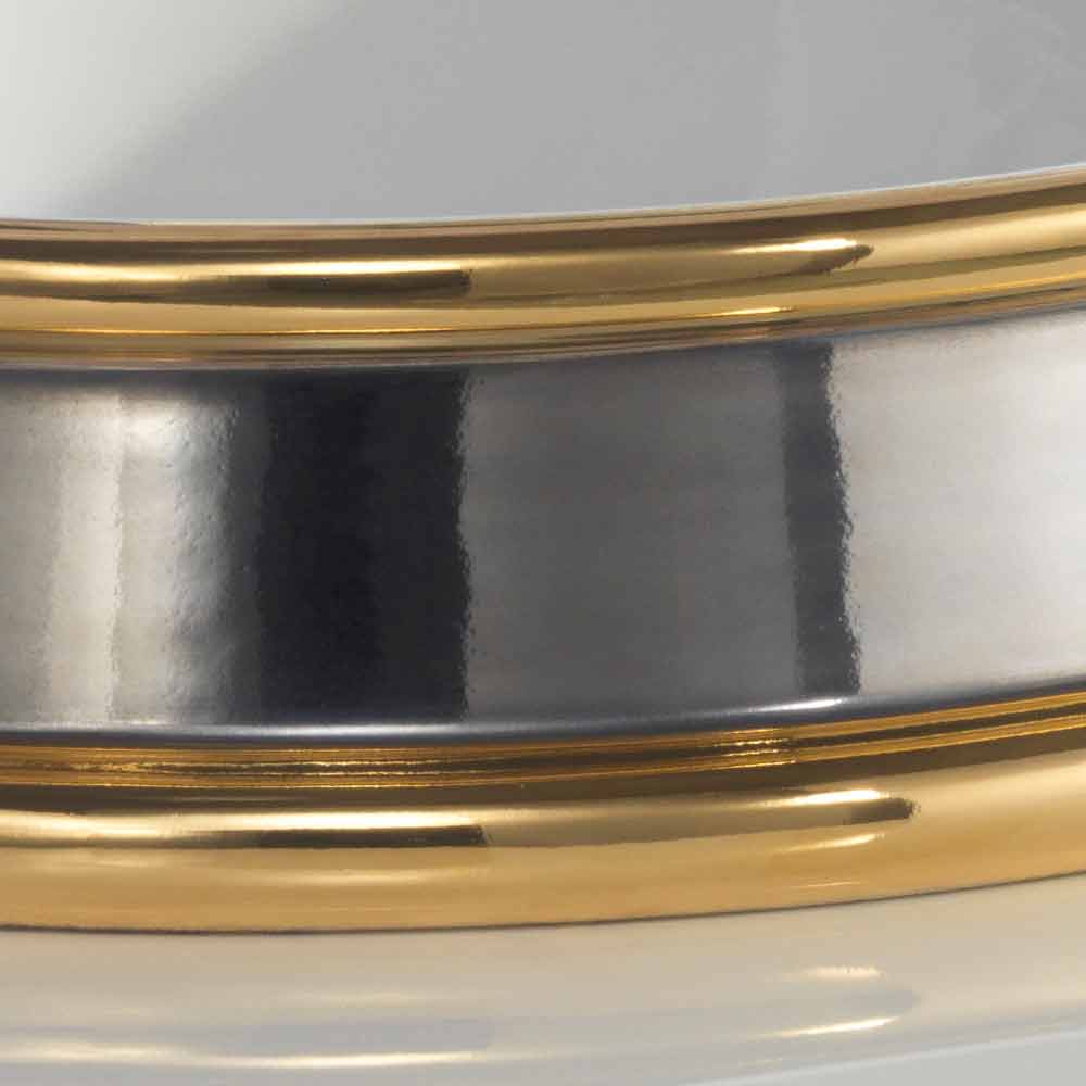 حوض غسيل نصف غائر من الطين الناري والذهب والبلاتين صنع في إيطاليا، مانيلو حوض حمام نصف غائر مصنوع في إيطاليا من طين النار المصنوع يدويًا مع شريط بلاتيني مطلي يدويًا وحلقات مطلية يدويًا بلمسة نهائية من الذهب عيار 24 قيراطًا.