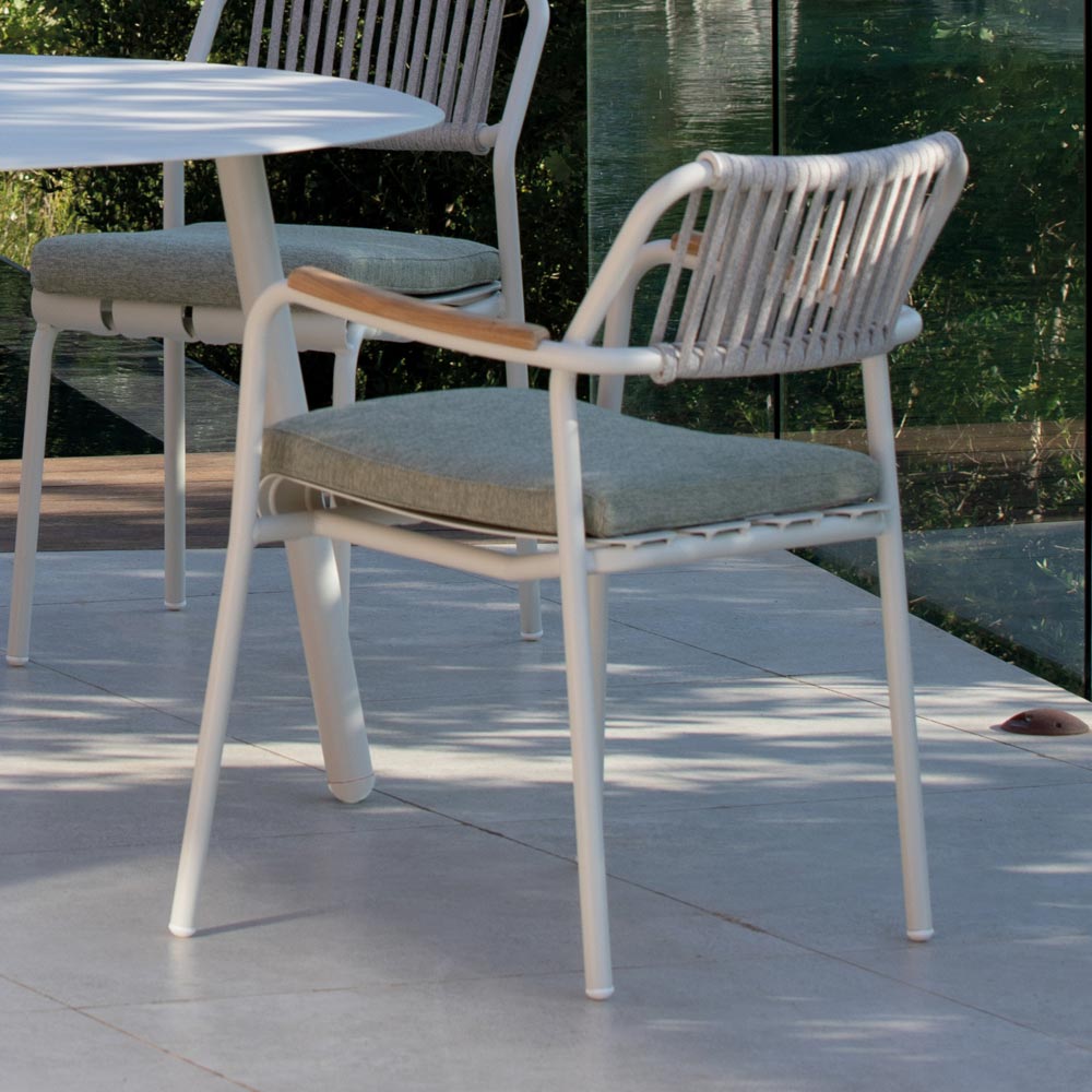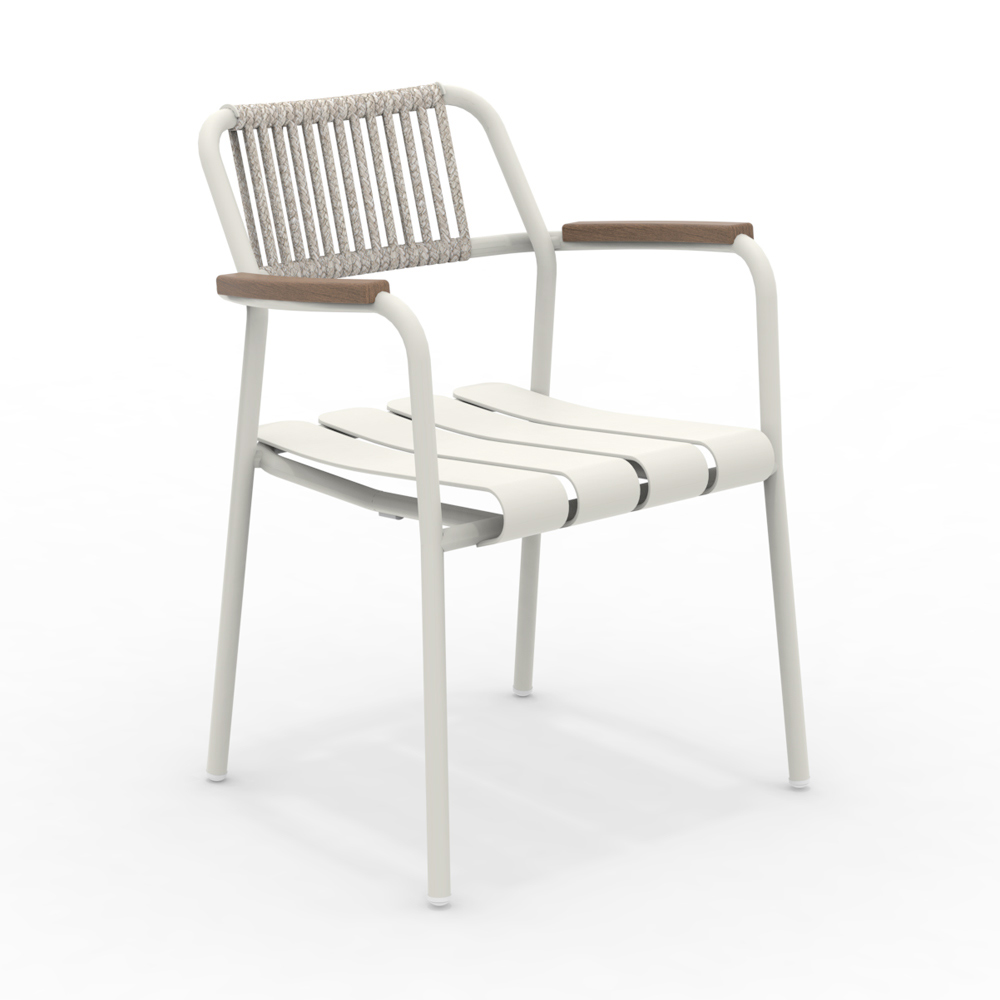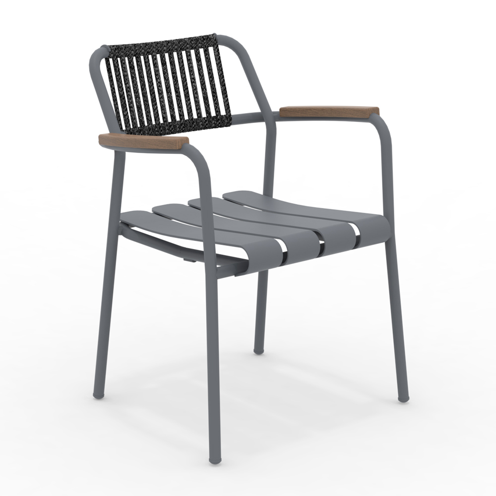 2 كرسيين بذراعين خارجيين مصنوعين من إطار من الألومنيوم ومساند ذراعين من خشب الساج FSC ومسند ظهر من الحبل.