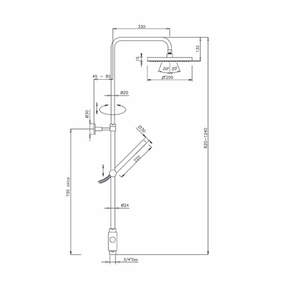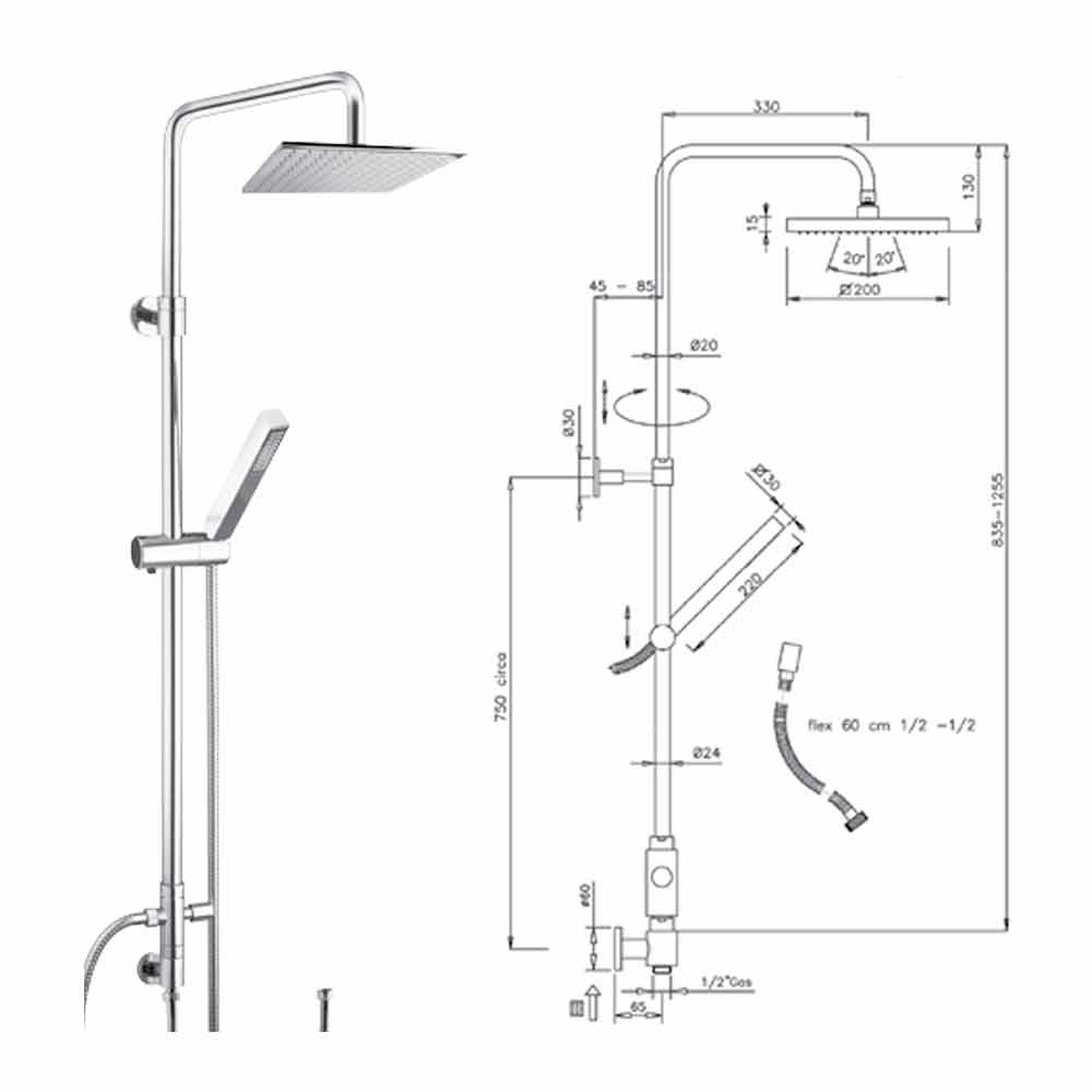 عمود دش نحاسي حديث مع رأس دش ABS مصنوع في إيطاليا ودش يدوي.