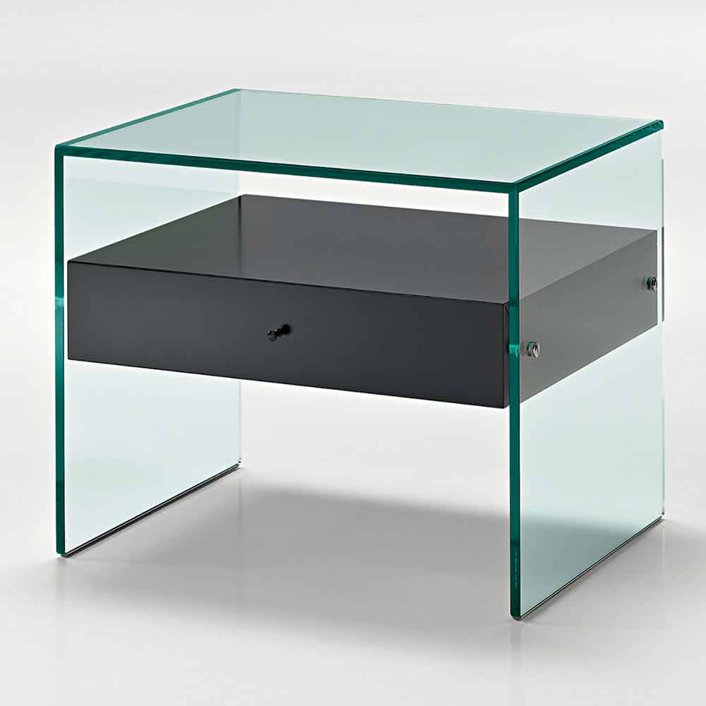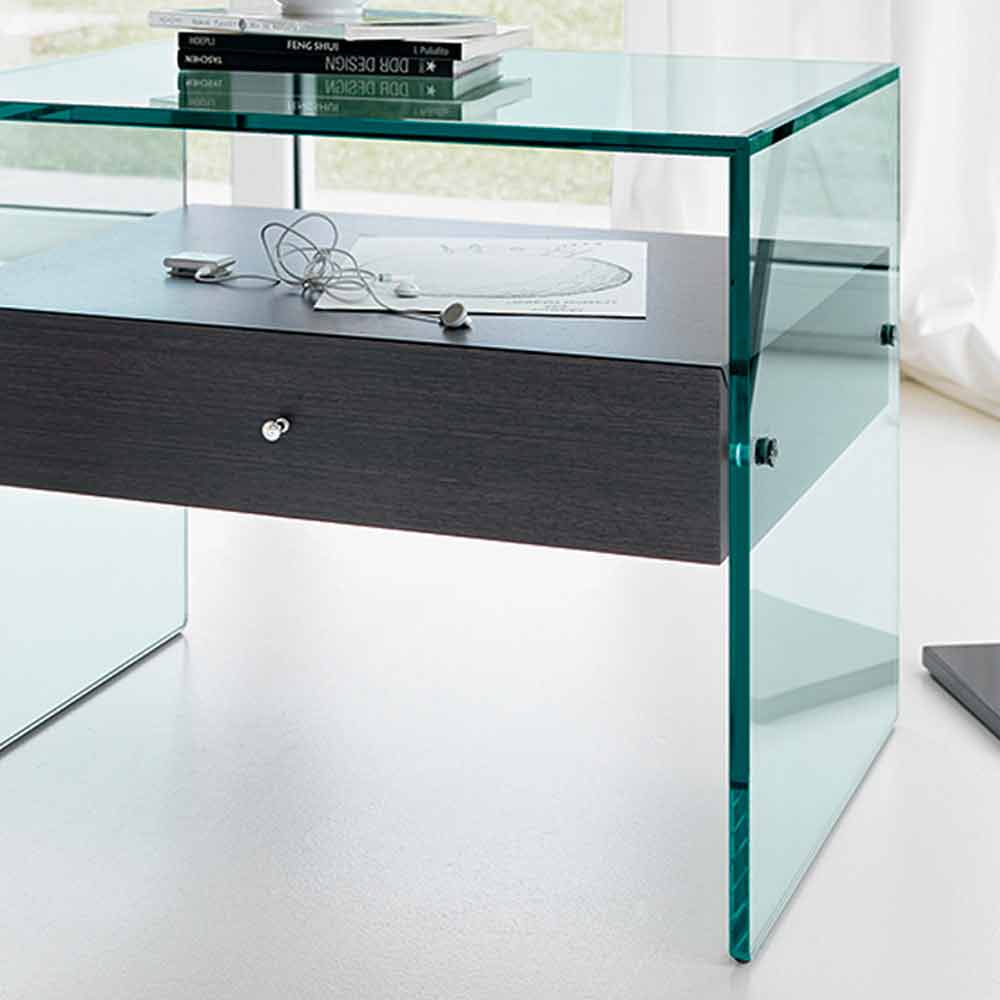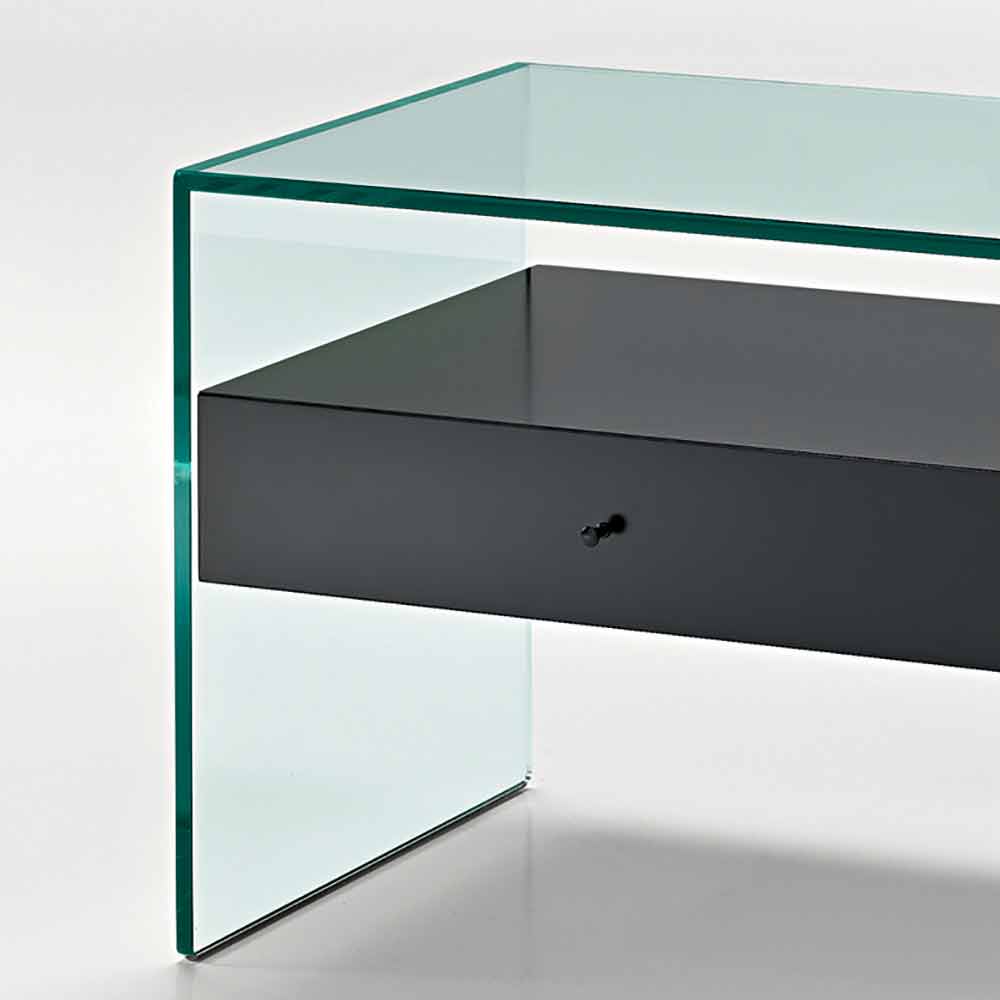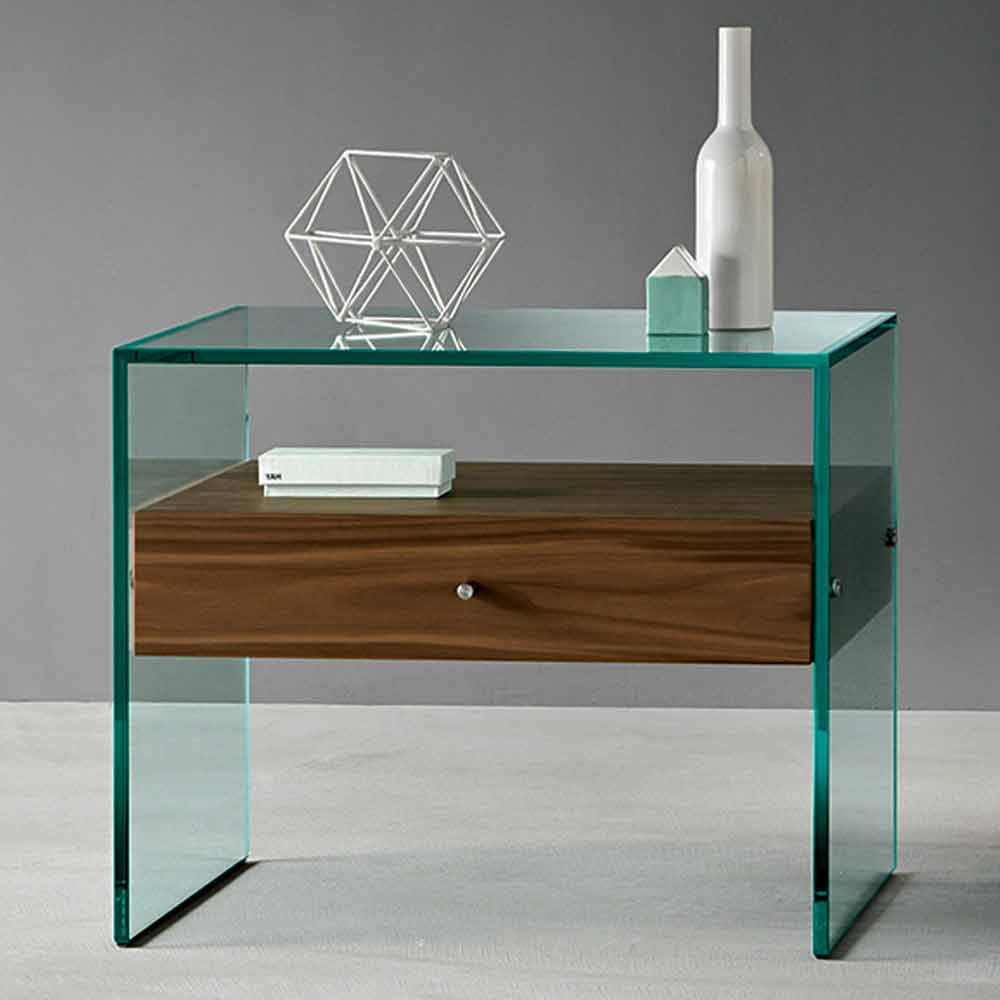 طاولة جانبية بتصميم عصري من الزجاج الشفاف مع درج خشبي، تم تصنيعها في إيطاليا يدويًا.