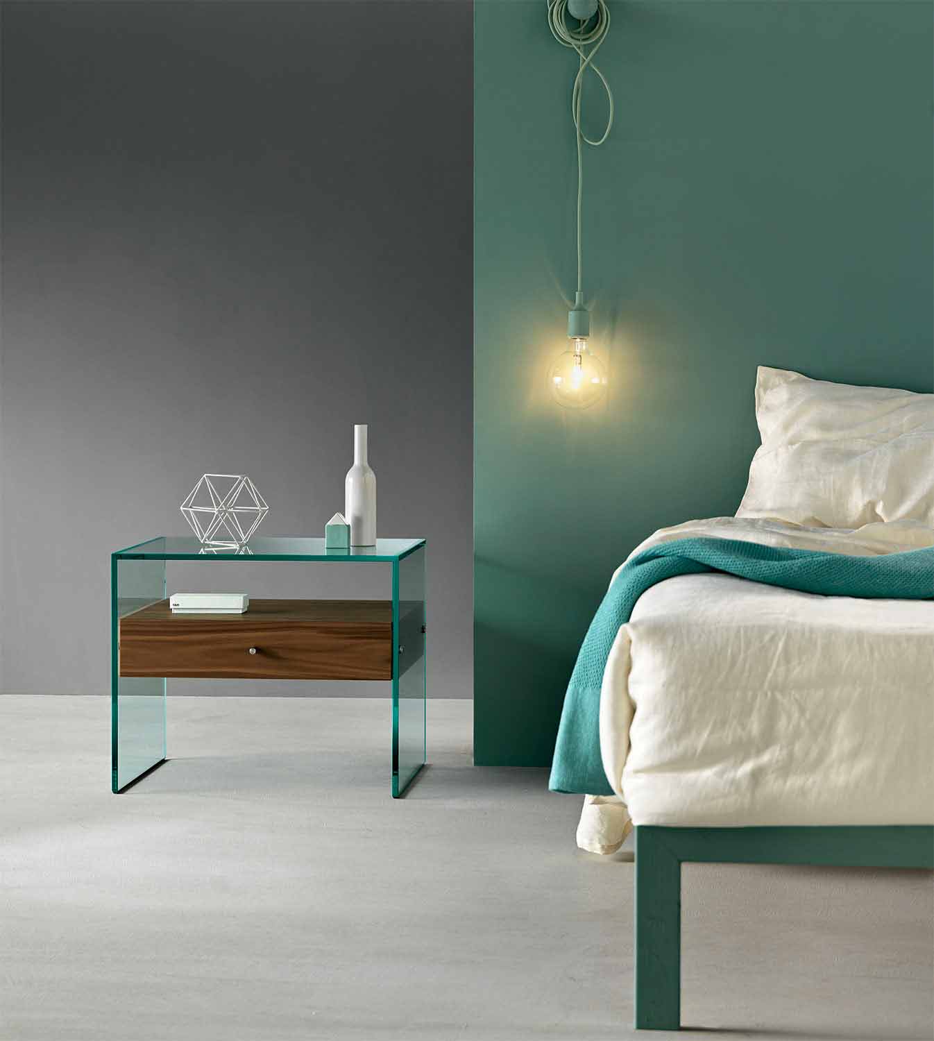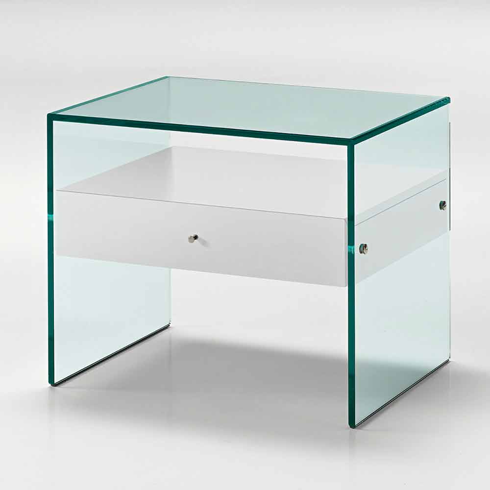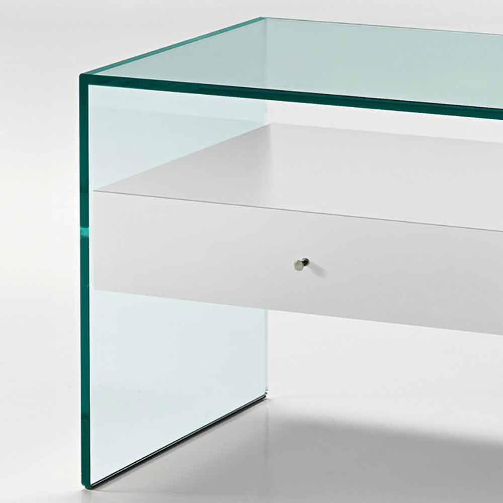 طاولة جانبية بتصميم عصري من الزجاج الشفاف مع درج خشبي، تم تصنيعها في إيطاليا يدويًا.