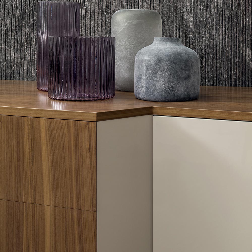 خزانة جانبية من خشب MDF مطلي بورنيش مع بابين وأدراج مركزية بارزة، تصميم صنع في إيطاليا.