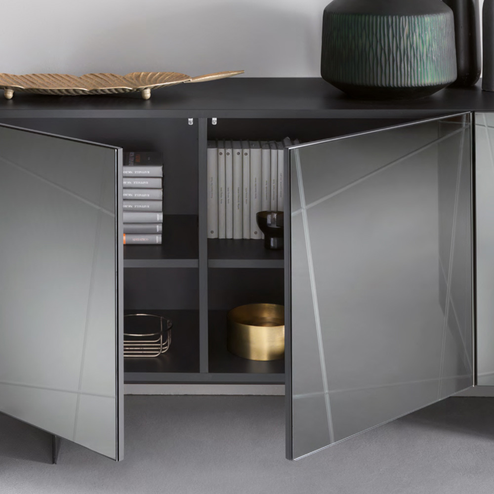 تُضفي الأبواب ذات اللمسة النهائية الرائعة الشبيهة بالمرآة جماليات المنتج من خلال إضفاء الضوء والتألق على الغرفة بأكملها، في حين أن الزخرفة الإبداعية ذات الخطوط الهندسية التي تميز السطح ضرورية لخلق إحساس بالديناميكية ، مما يجعل الشكل الصارم للخزانة الجانبية أكثر رقة.