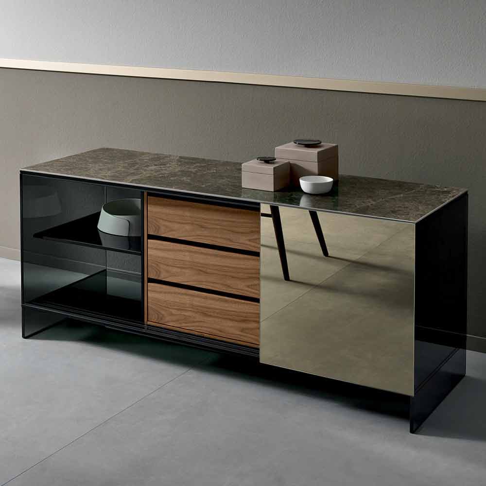 خزانة جانبية بتصميم عصري وفخم مع هيكل من الزجاج المدخن وباب مرآة من البرونز، مصنوعة يدويًا في إيطاليا.