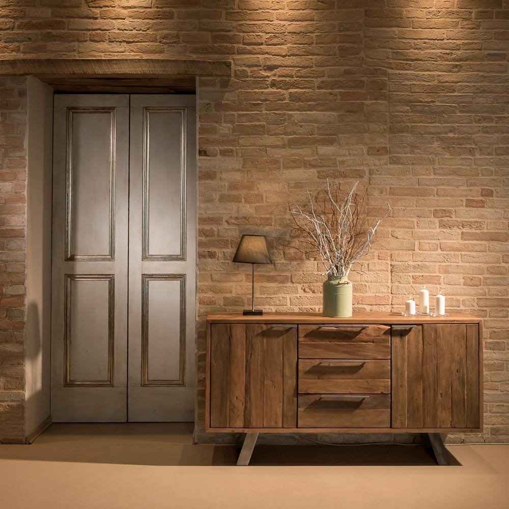 خزانة جانبية داخلية مصنوعة من الخشب المعاد تدويره بلون القهوة الطبيعي مع بابين و 3 أدراج مع أقدام معدنية . هذه المجموعة من الأثاث فريدةٌ من نوعها، لأنها تُجسّد التاريخ العريق لهذه المادة المُستخدمة. صُنعت هذه المجموعة يدويًا إلى حد كبير. كل خدش أو عيب، وكل ندبة على الخشب، تشهد على أصالة الماضي الذي أُعيد إحياءه. يُعالَج الخشب الاستوائي المُعاد تدويره ، والمُستخرج من التحف القديمة والقوارب والمباني المهجورة، ويُنظّف بمهارة لاستعادة رونقها ولمعانها. يجمع هذا المنتج بين جوهر الذوق الريفي وأشكال التصميم المعاصر ، مع بعض تفاصيل الطراز الصناعي .