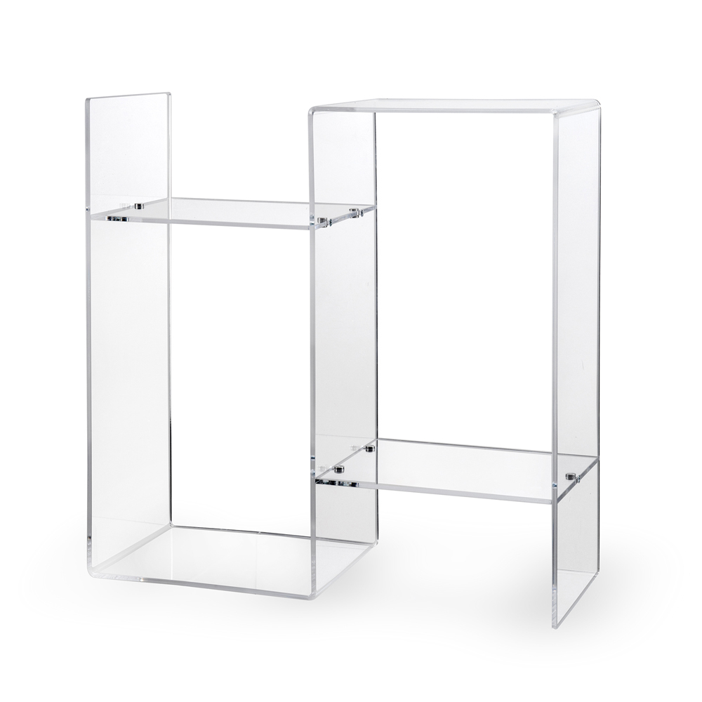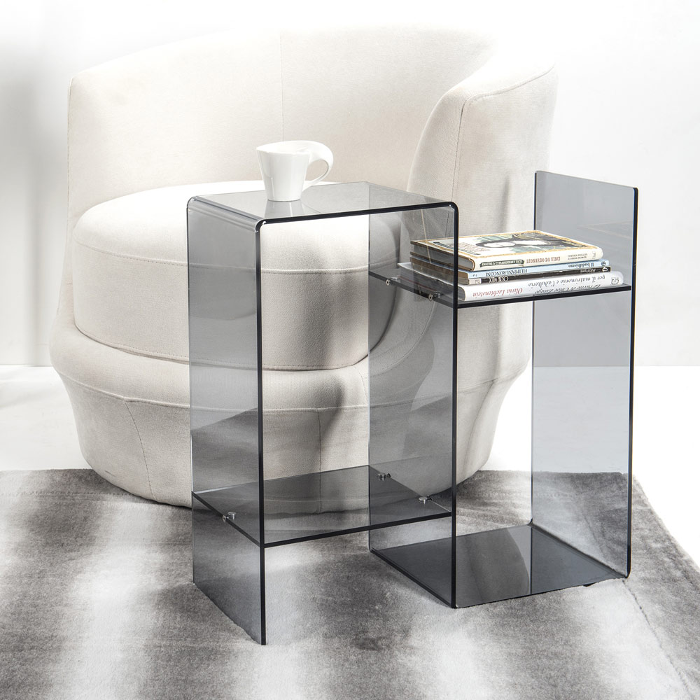 طاولة قهوة جانبية للأريكة، مصنوعة بالكامل في إيطاليا باستخدام زجاج شبكي ، وهي مادة مبتكرة مثالية لإنتاج إكسسوارات الأثاث، فهي غير سامة، مضادة للحساسية، عديمة الرائحة، مضادة للبكتيريا، وقابلة لإعادة التدوير بنسبة 100%. تصميمها البسيط والخطّيمزود برفّين لمزيد من العملية، ويُبرز سطوعهاوتألقها اللذين يبقيان ثابتين على مر الزمن.