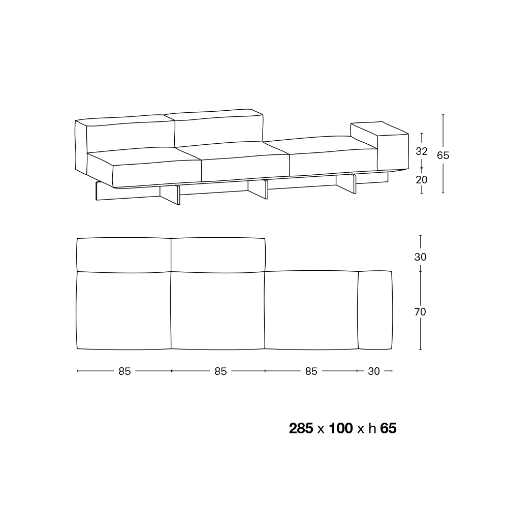 الطول 285 سم × العمق 100 سم × الارتفاع 65 سم