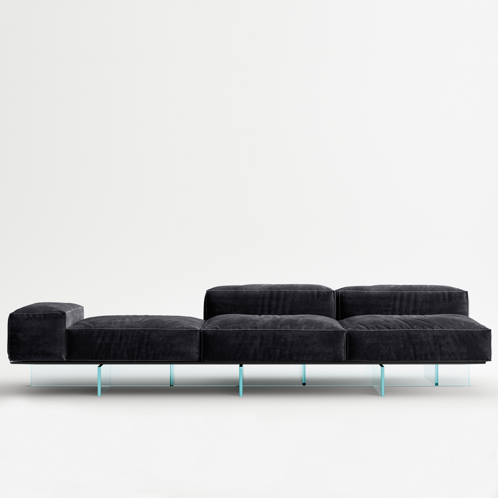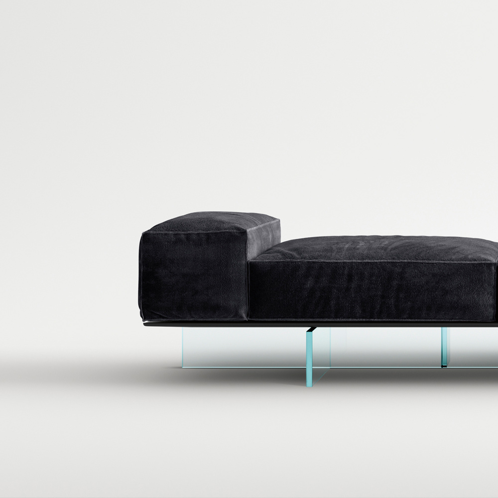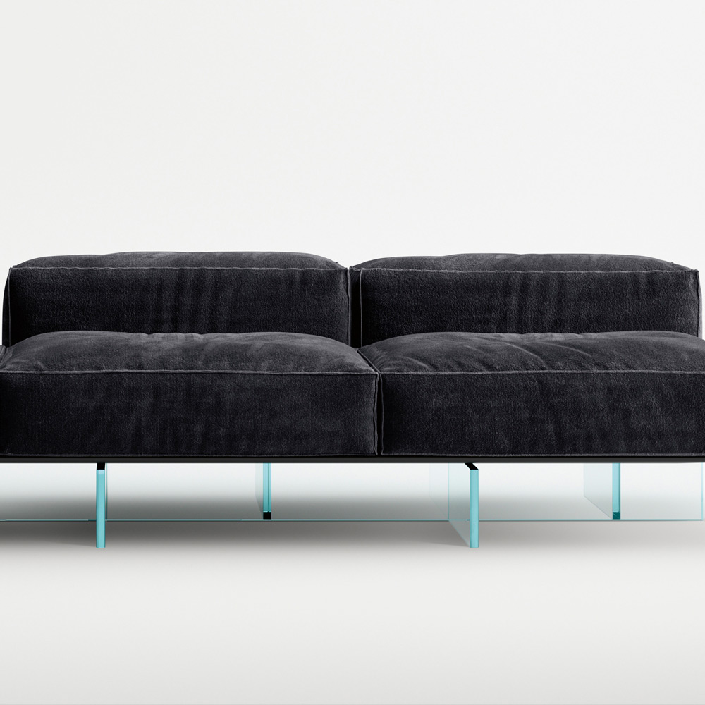 أريكة معيشة بمقعدين مع وسادة ، مصنوعة من هيكل متين من الخشب المصمت، على قواعد من زجاج شفاف للغاية بسمك 20 مم، ملحوم ومُصفح . المقعد والظهر مُنجدان برغوة البولي يوريثان متغيرة الكثافة، ومرتبة من ألياف الأكريليك، ومغطاة بقماش واقٍ. الغطاء الخارجي مصنوع من قماش قابل للإزالة بخياطة مزدوجة ظاهرة. يتألف نظام المقاعد من مساحات ناعمة ومبطنة بسخاء، ويُقدم أسلوبًا جديدًا لتصميم مساحة المعيشة، بعناصر تُتيح تركيبات أصلية وأكثر ديناميكية وعفوية. تحتفظ الأريكة بخفتها البصرية بفضل قاعدتها المصنوعة من أرجل زجاجية مغلفة تدعم منصة خشبية تستقر عليها العناصر المنجدة. تُعدّ الأقمشة الراقية عالية الجودة والتفاصيل الدقيقة في التغليف من السمات المميزة لهذا المشروع ذي الطابع غير التقليدي.