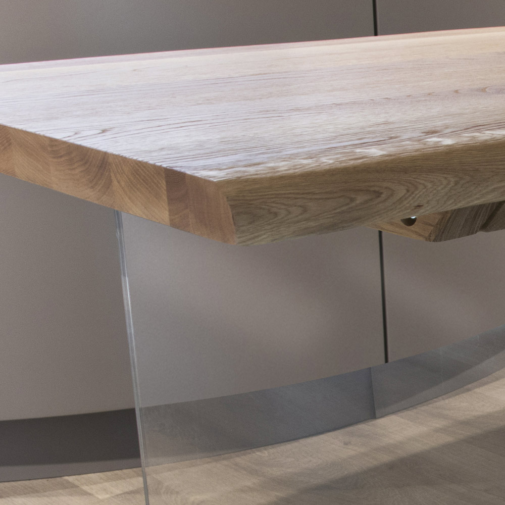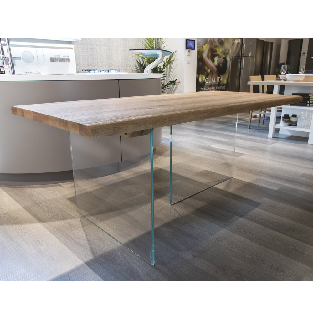 طاولة خشبية مطلية بخشب البلوط المعقود وقاعدة من الكريستال صنع في إيطاليا.