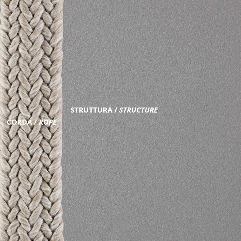 كرسيان بذراعين قابلان للتكديس،مصنوعان يدويًا في إيطاليا من الفولاذ المجلفن بلون الطين، مع مقعد ومسند ظهر من حبل بلون الطين . يُتيح الجلفنة مقاومةً أكبر للطبقة الخارجية للمادة ضد العوامل الجوية المسببة للتآكل، مثل الملح وحموضة المطر، بينما تُقاوم الحبال الكلور وأشعة الشمس، بالإضافة إلى كونها مضادة للعفن.
