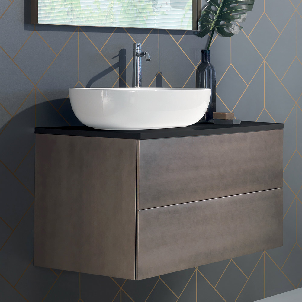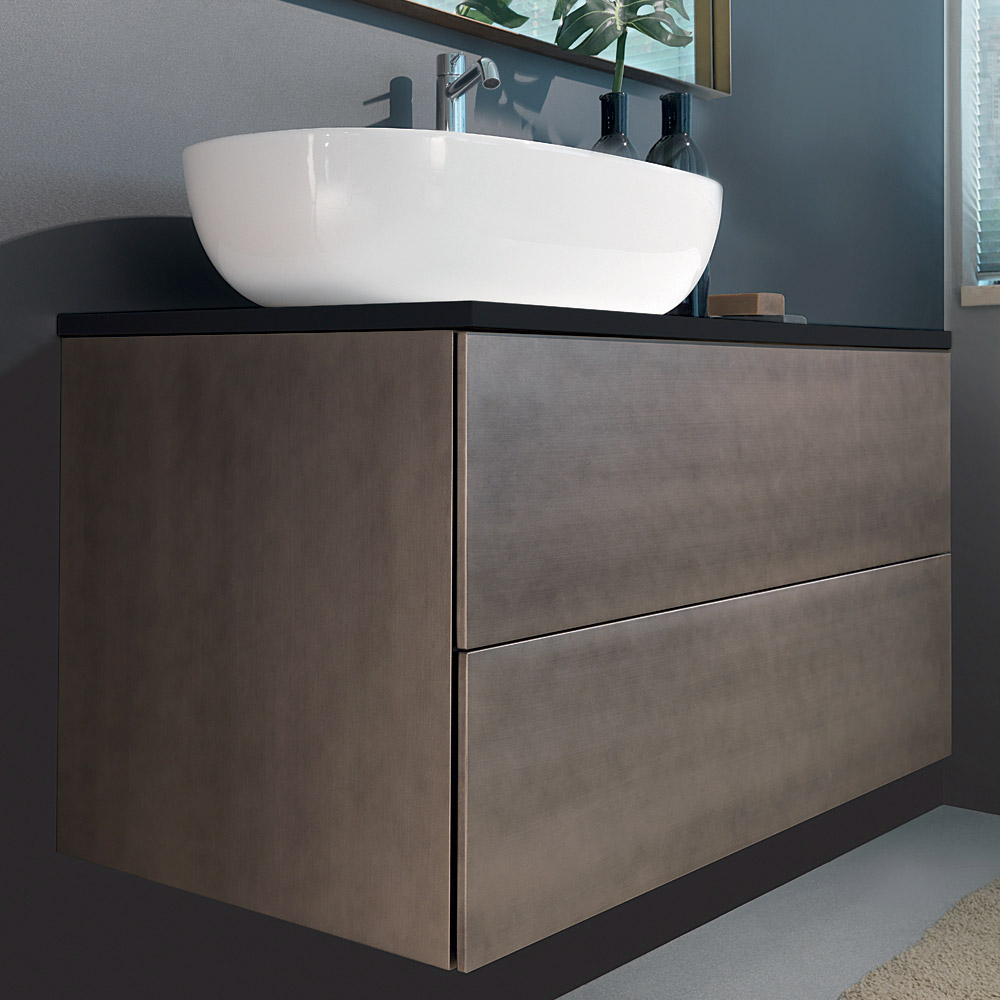 يتميز هذا التكوين لأثاث الحمام بنقاء الخطوط واللمسة النهائية المكررة للغاية. تتضمن المجموعة قاعدة حوض غسيل مع درجين من خشب MDF مع لمسة نهائية مطلية بالبلاتين غير اللامع الثمين، وسطح خشبي مطلي باللون الأسود غير اللامع مع حوض غسيل من السيراميك الأبيض. إن اللمسات الحصريةالمصنوعة يدويًا بالكامل لها تأثير المعادن الثمينة العتيقة وتجعل المنتج، بجودة إيطالية بالكامل، متطورًا وراقيًا. في نهاية التصميم الوظيفي ، نظام الفتح الكامل بنظام الدفع والسحب ومرآة ذات 4 جوانب مصقولة بالرمل لإضاءة LED مدمجة ، مع إطار معدني مطلي بالبلاتين العتيق.