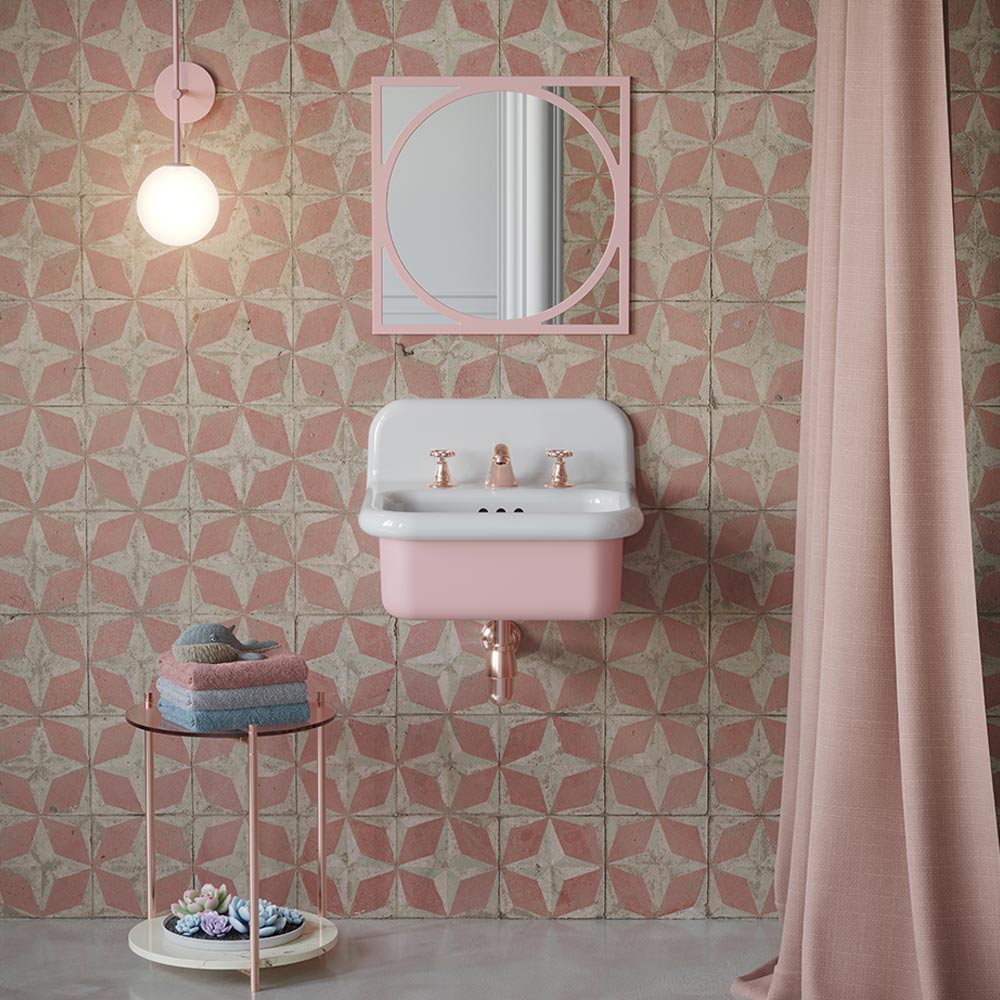 حوض حمام مع هيكل معلق من السيراميك باللونين الأبيض والوردي الحلوى.