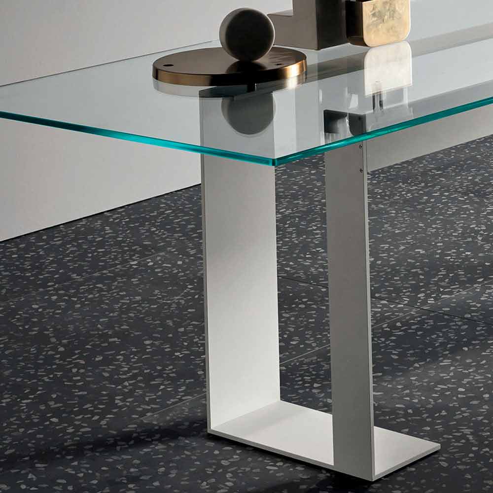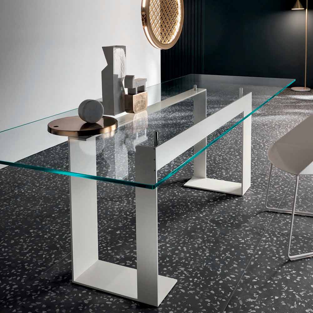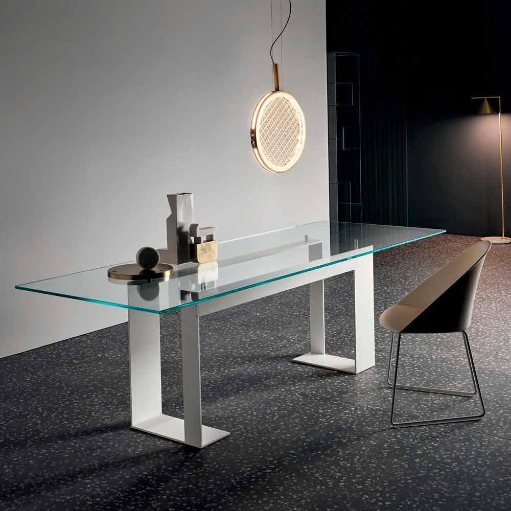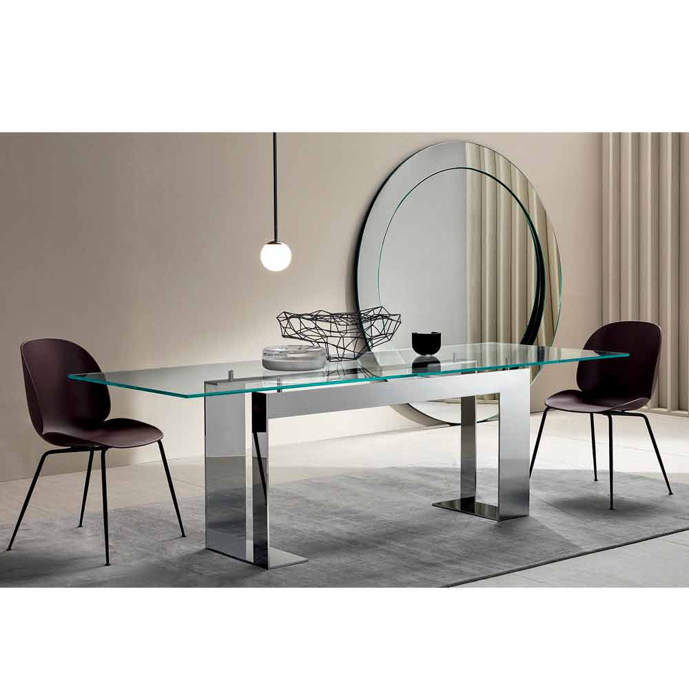 تتميز طاولة الطعام هذه بوجود سطح زجاجي مقوى شفاف للغاية يرتكز على 4 دعامات ترفعها عن الهيكل المعدني المتوفر بثلاثة تشطيبات و4 أحجام مختلفة.