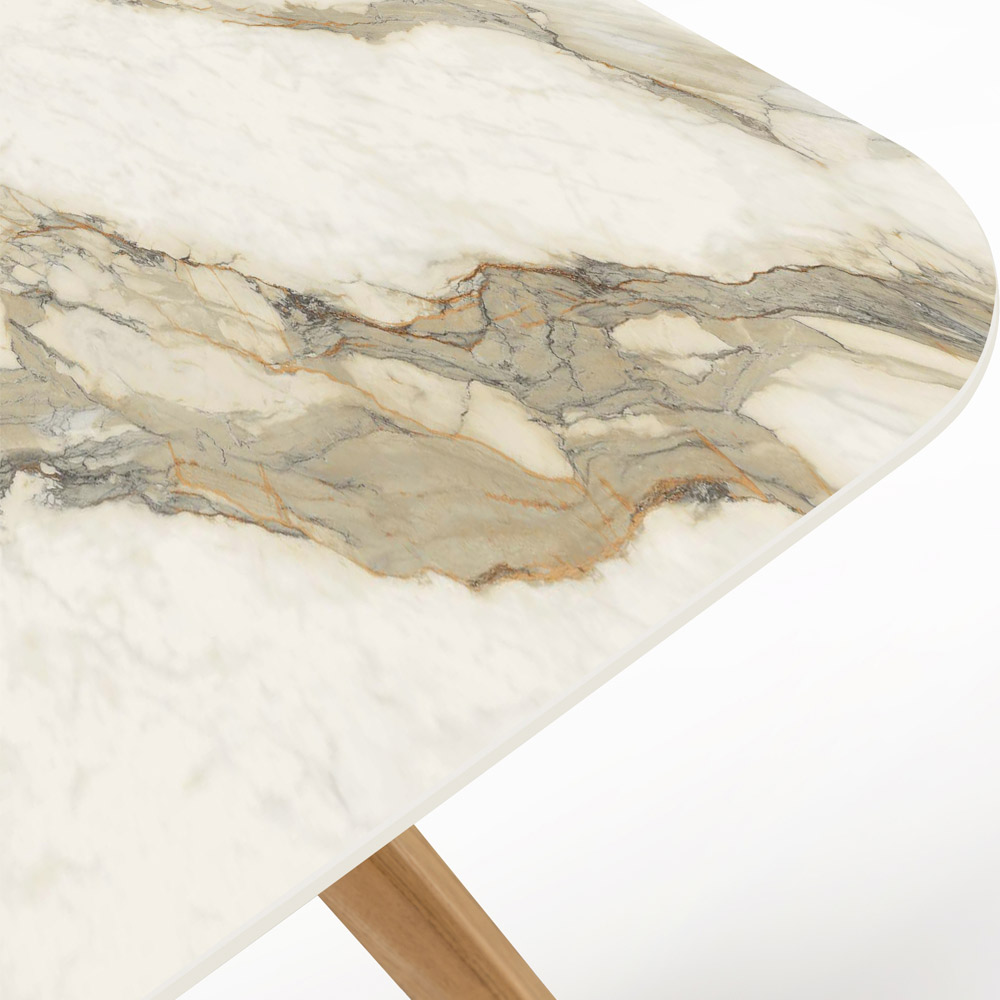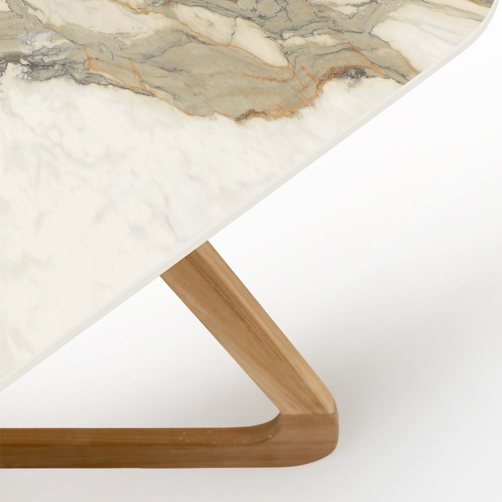 صنع بالكامل في إيطاليا. هذه الطاولة الخارجية تحفة فنية في التصميم، تجمع بين فن السيراميك وحرفية الخشب. سطحها الخزفي مستوحى من رخام كالاكاتا هيرميتاج الفاخر، المعروف بعروقه الرمادية-الخضراء المتشابكة على خلفية بيضاء كريمية، مما يضفي لمسة من الفخامة والرقي على أي مساحة خارجية.