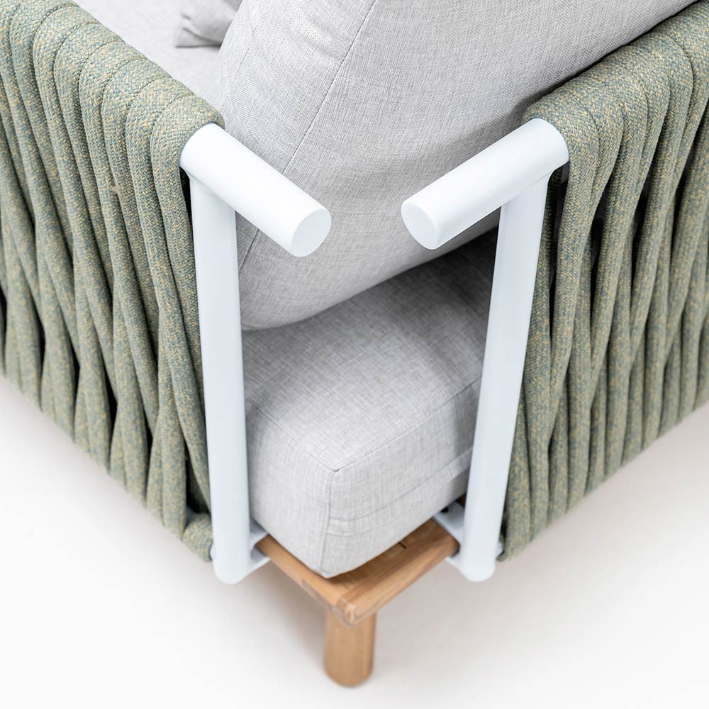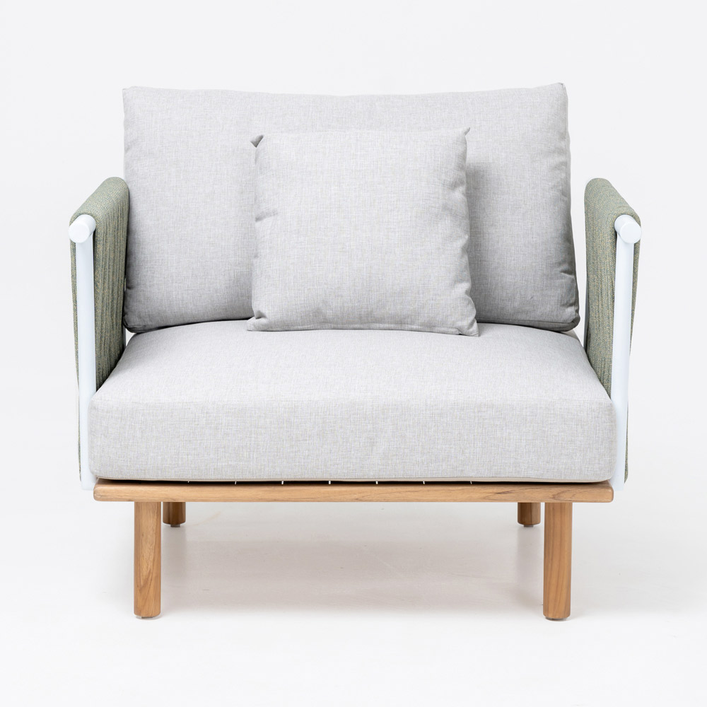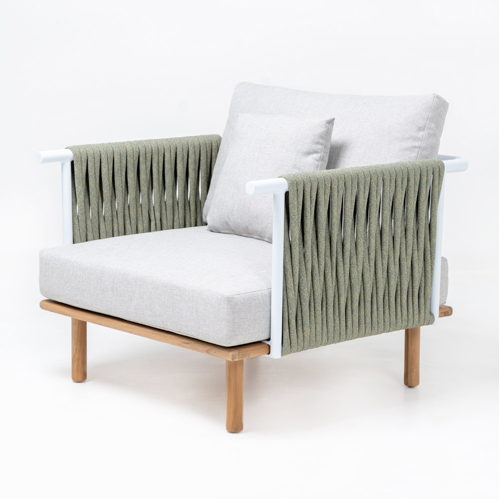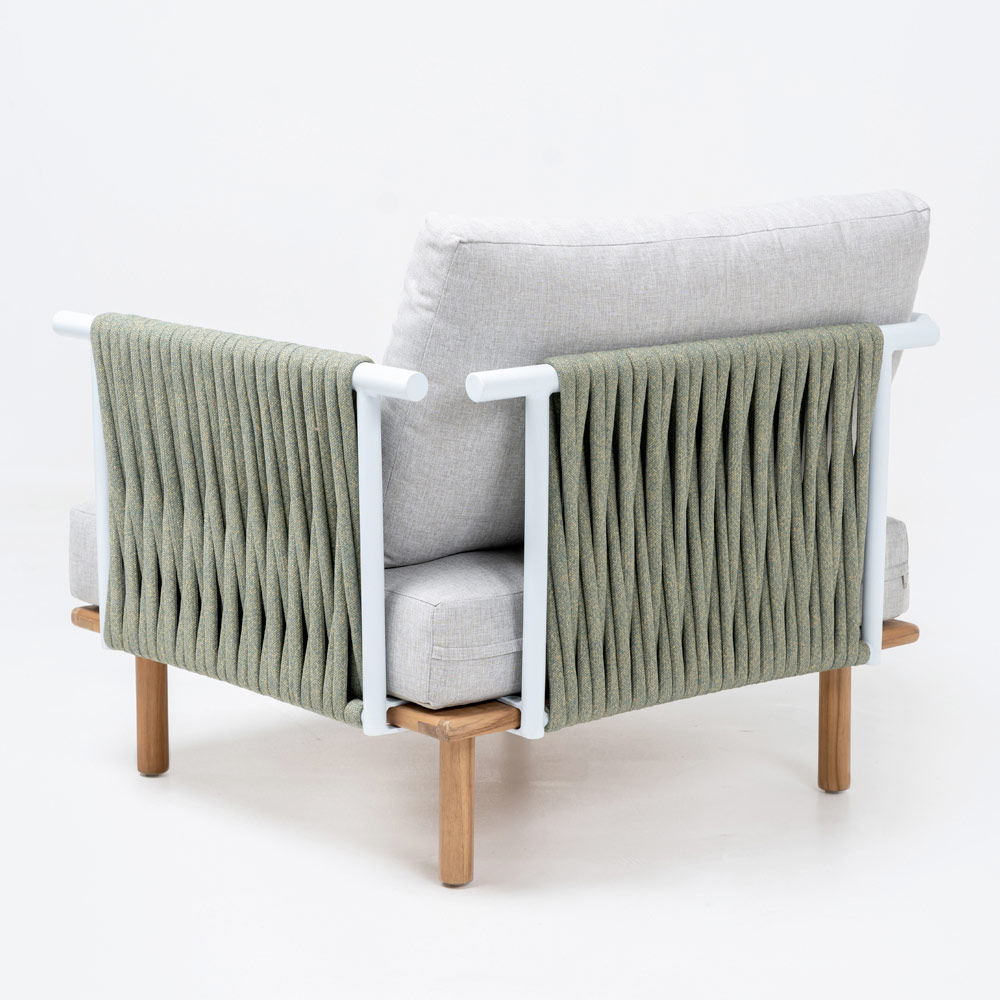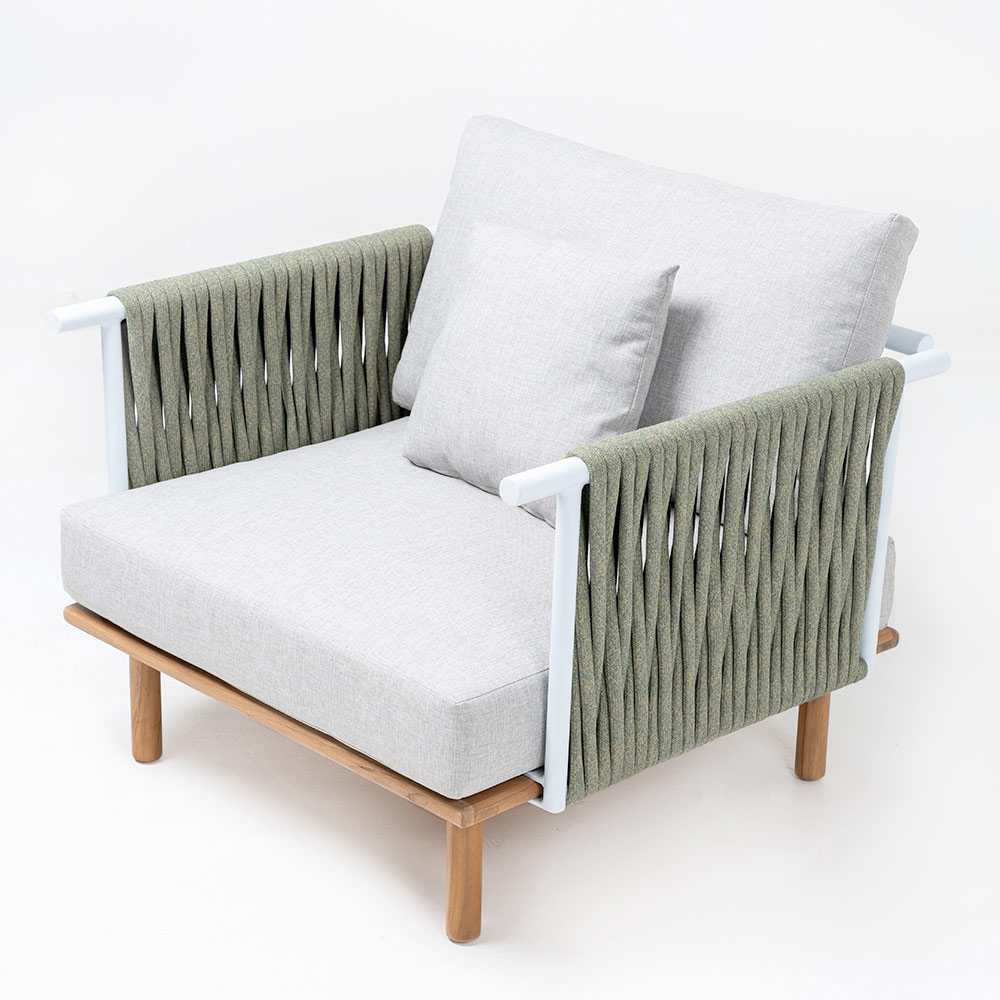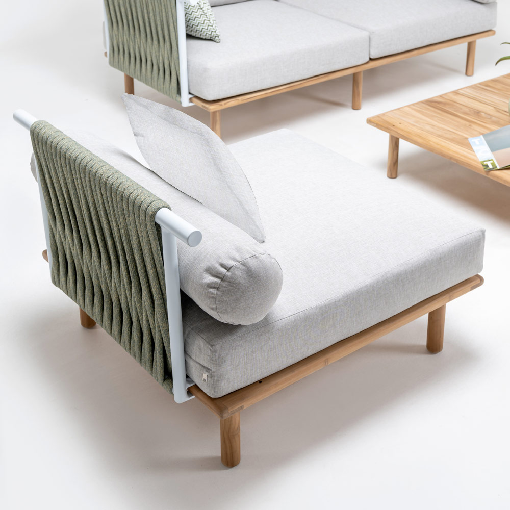 كرسي حديقة من خشب الساج، ومساند ظهر من الألومنيوم ونسيج من الأوليفين/حبل من البولي بروبيلين ووسادة