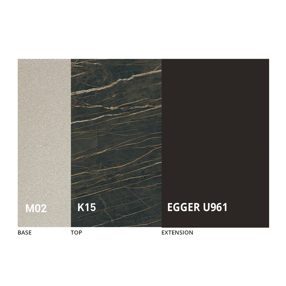 طاولة قهوة قابلة للتحويل ، مصنوعة يدويًا في إيطاليا، بسطح سيراميك غير لامع ، وجانب داخلي من الميلامين، متناسق مع سطح وقاعدة معدنيين مطليين بنقوش غريسو، وعجلات عرضية قابلة للسحب. تتميز هذه الطاولة بخطوط أنيقة وأساسية ، وتصميم متعدد الاستخدامات، مما يجعلها مثالية لتأثيث أي نمط من البيئات، وهي مصممة خصيصًا لمن يبحثون عن طاولة قهوة عصرية، يمكن عند الحاجة أن تتحول إلى طاولة طعام عملية وموفرة للمساحة، مثالية لتحسين استغلال المساحات في غرف الطعام أو غرف المعيشة الصغيرة.