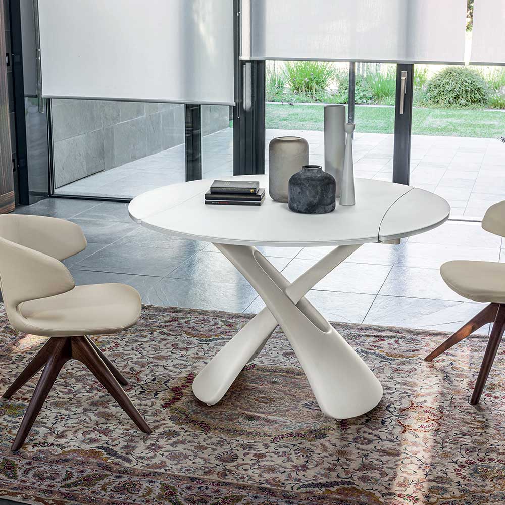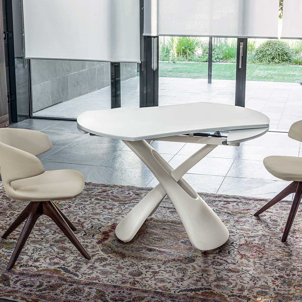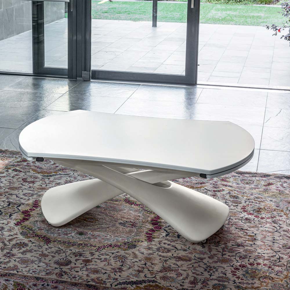 تتحول طاولة القهوة هذه إلى طاولة طعام من خلال آلية الغاز،تحتوي على قاعدة معدنية مغطاة بالبولي يوريثين الصلب مطلية بطبقة نهائية بيضاء منقوشة مع عجلات قابلة للسحب وقمة غير منتظمة يمكن تحويلها إلى قمة مستديرة مصنوعة من الزجاج المحفورعلى اللوحة.
