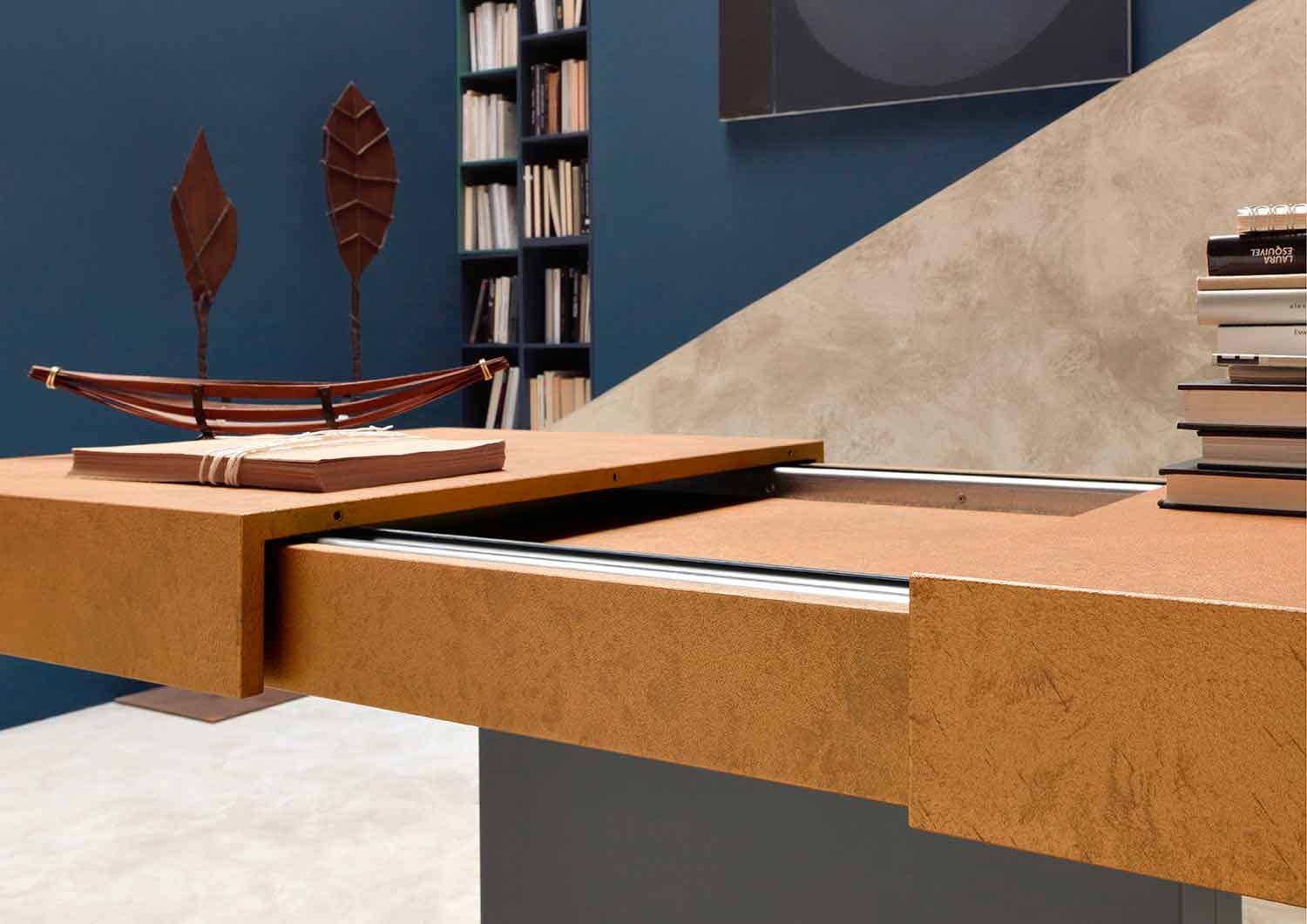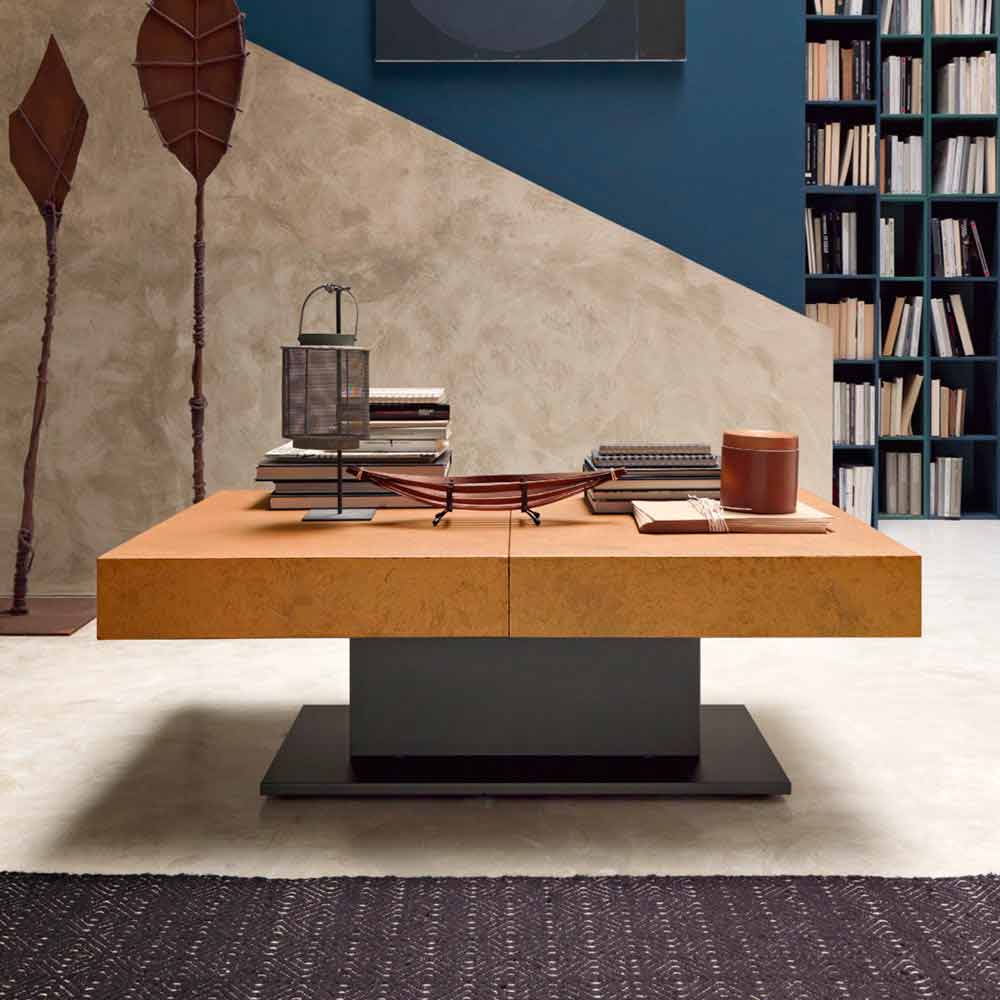 طاولة قهوة قابلة للتحويل بتصميم أنيق مع سطح بتأثير الملاط وقاعدة فولاذية، صنع في إيطاليا.
