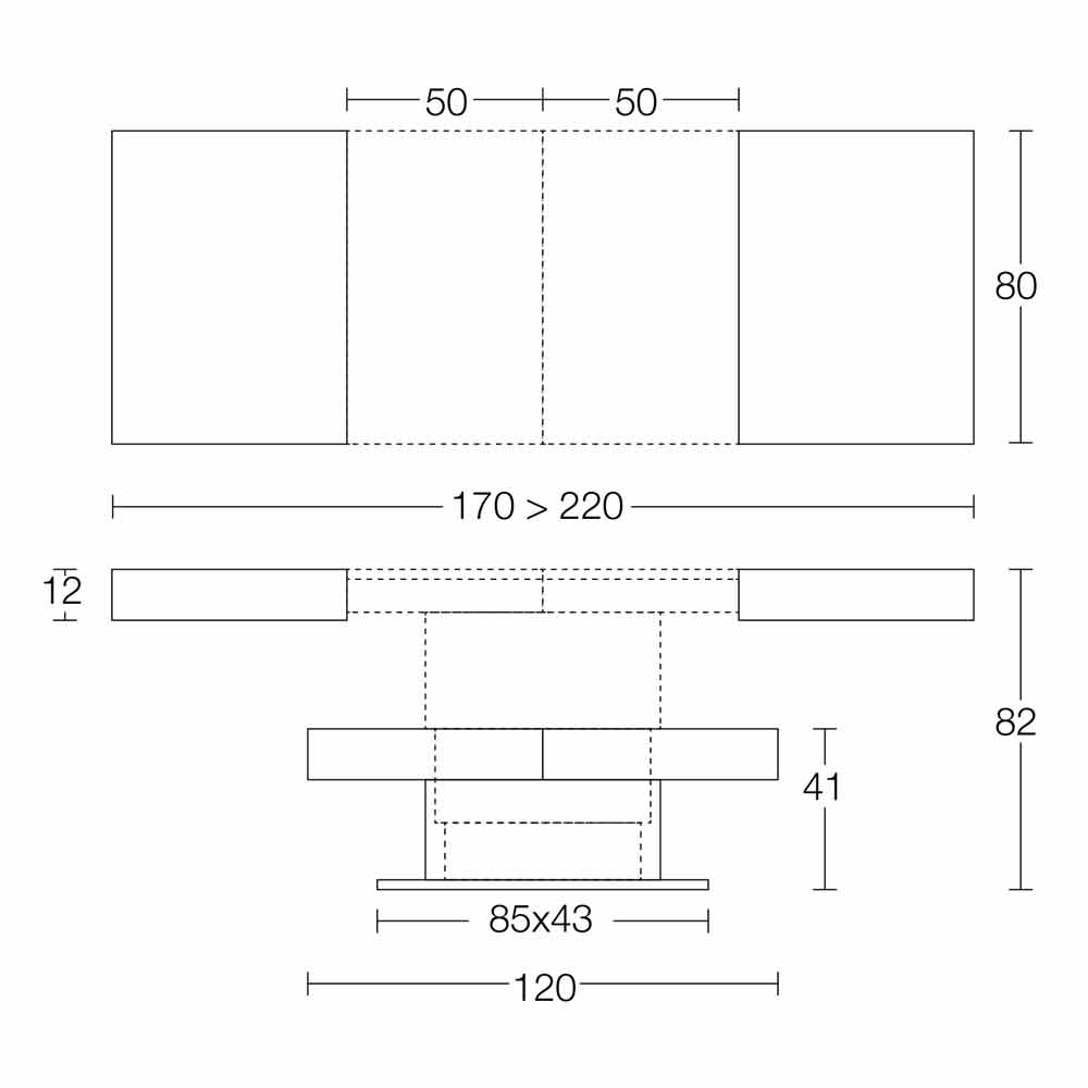 الجزء العلوي مستطيل الشكل وقابل للتمديد من خلال امتدادين (داخليين) يبلغ طول كل منهما 50 سم ويمكن تحويله إلى طاولة طعام بفضل آلية الغاز التي تضبط الارتفاع بالمليمتر: من 41 سم إلى 82 سم.