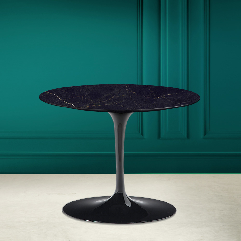 طاولة قهوة مستديرة مع سطح من السيراميك الأسود وقاعدة من الألومنيوم المصقول، صنع في إيطاليا