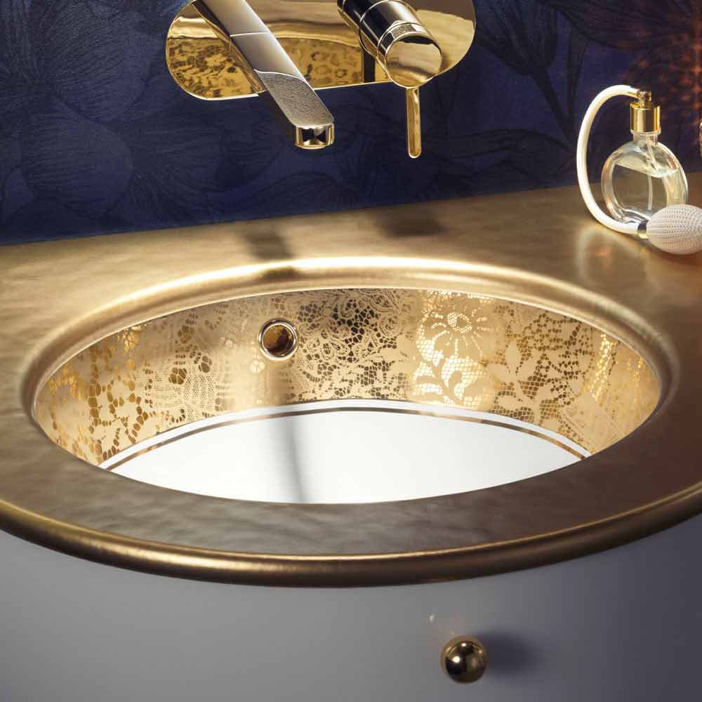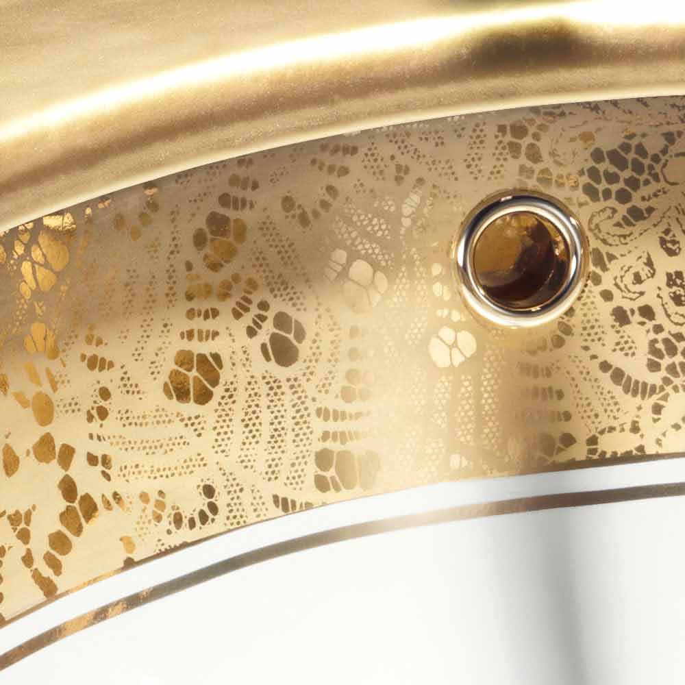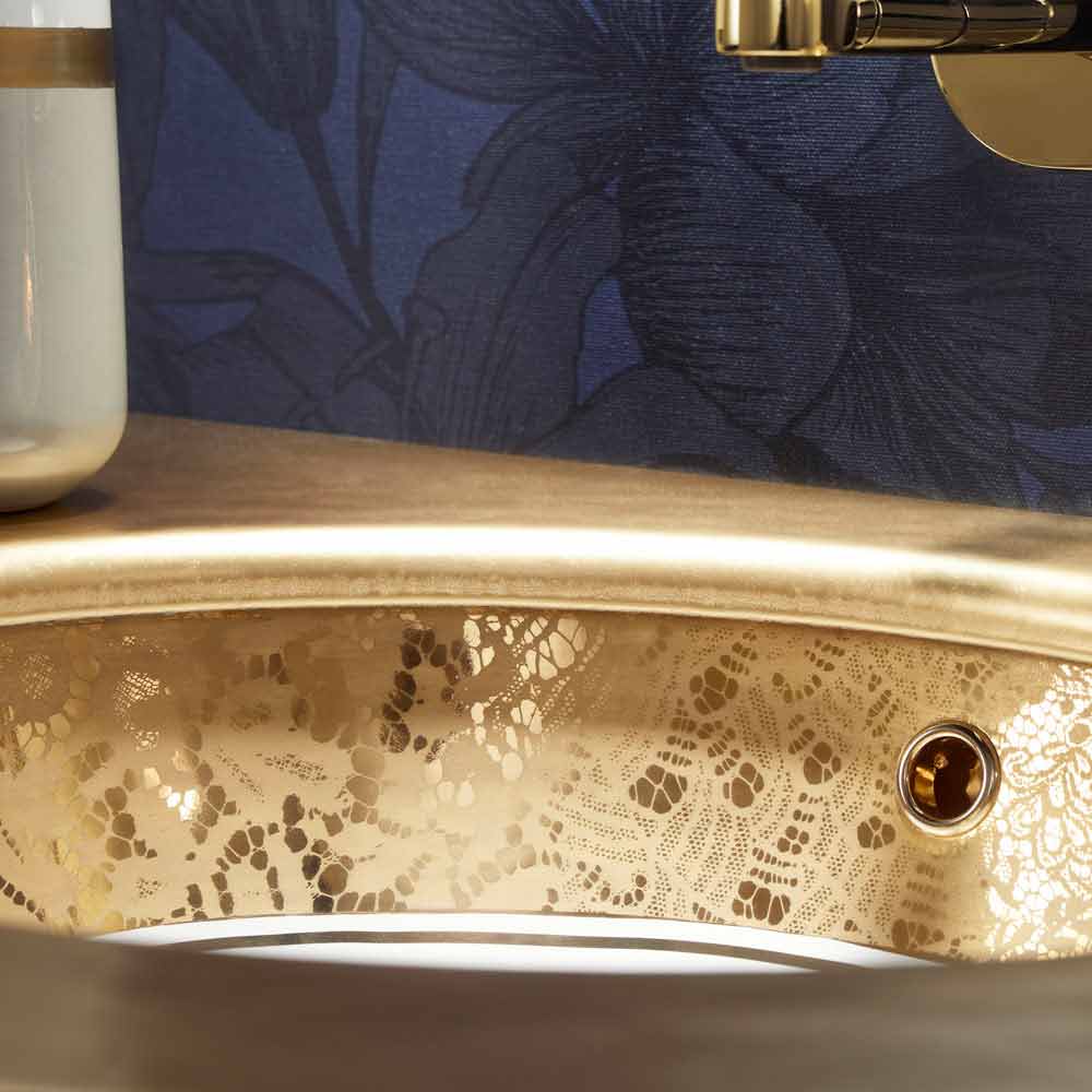 حوض غسيل تحت الطاولة مصنوع من طين النار والذهب، مصنوع يدويًا في إيطاليا، إيجيو حوض حمام مدمج مصنوع في إيطاليا من طين النار المصنوع يدويًا مع شريط مزخرف وشرائح من الذهب عيار 24 قيراطًا.