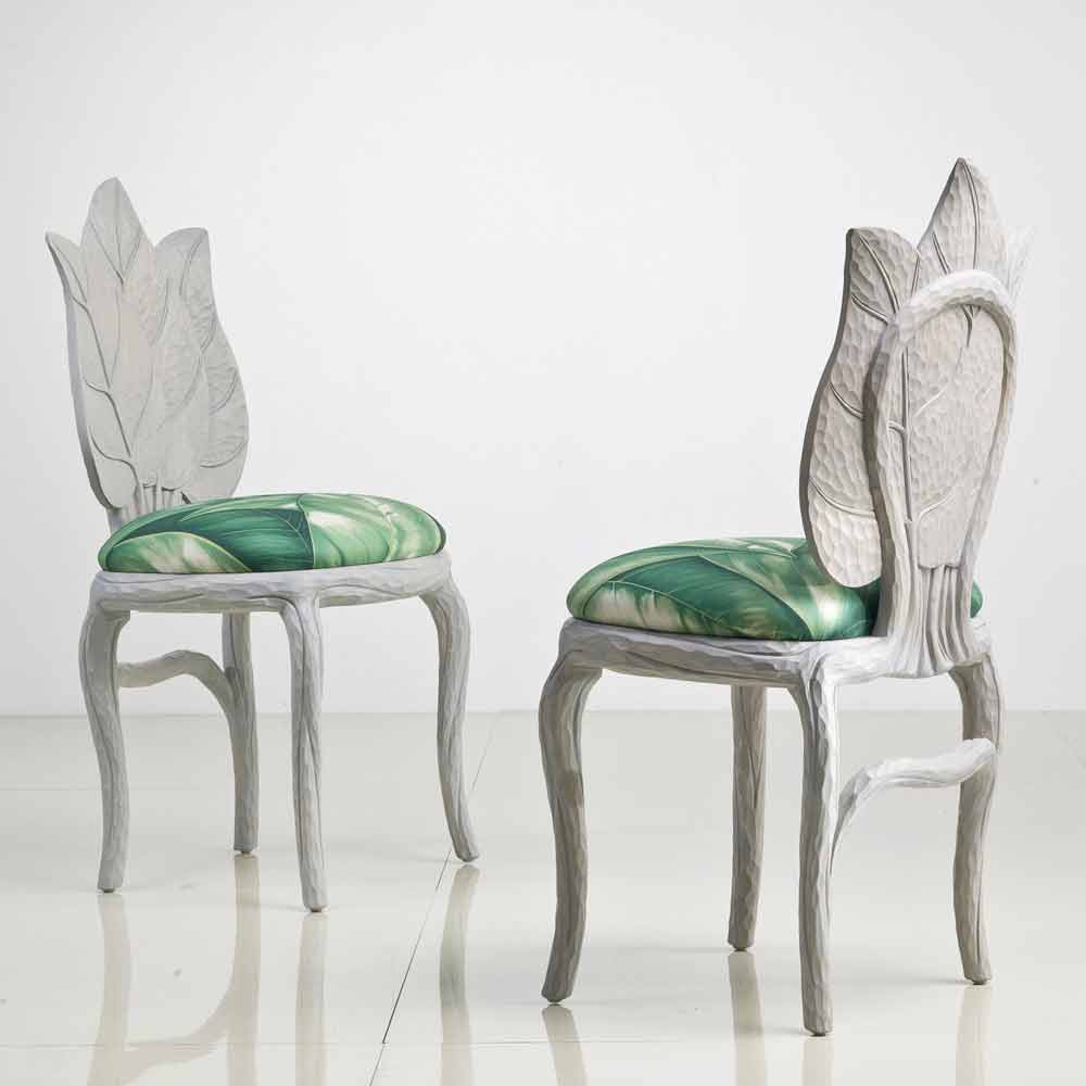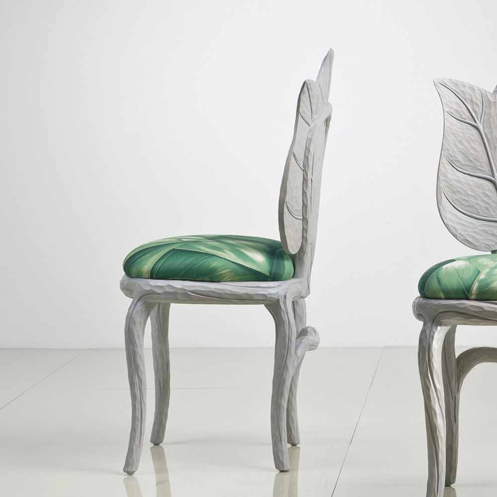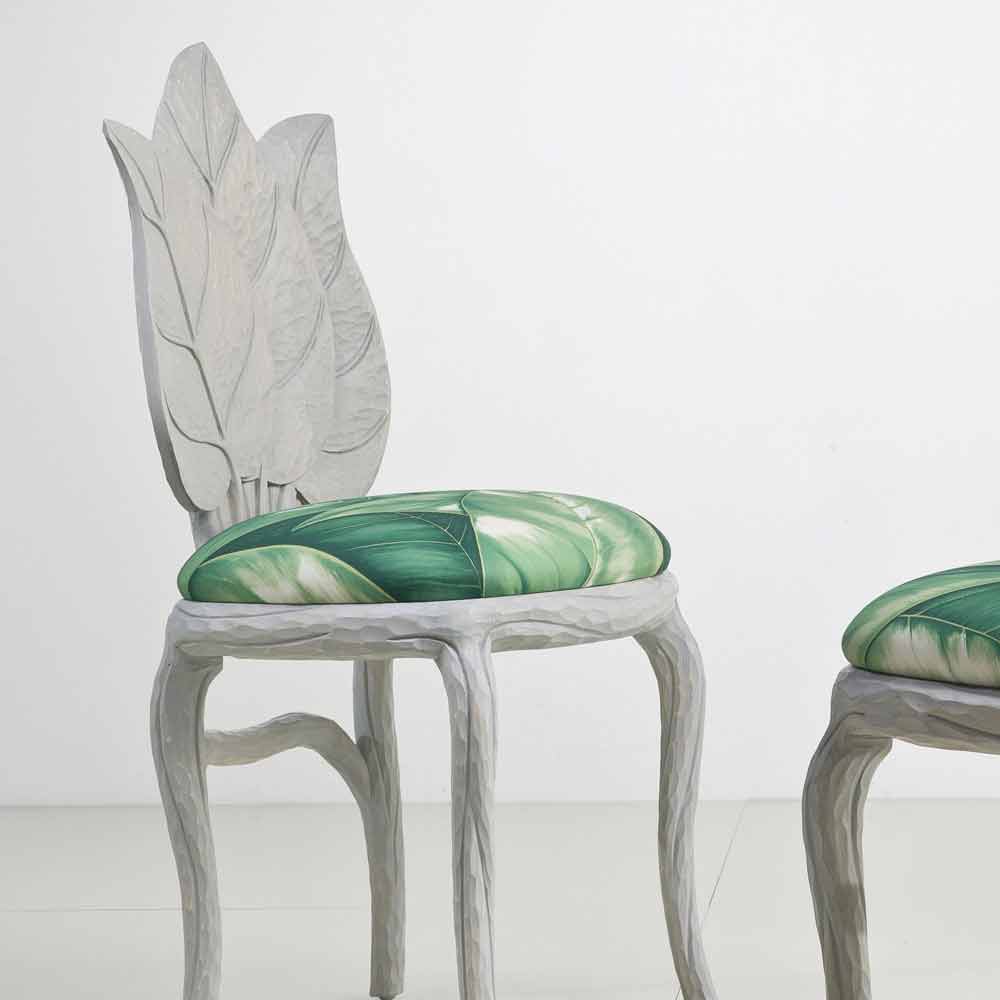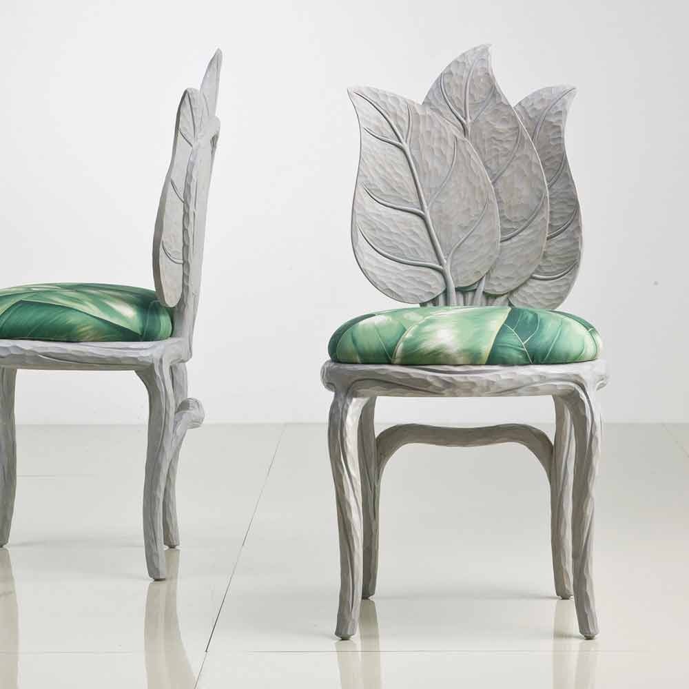 كرسي طعام مبطن بتصميم عصري، صنع في إيطاليا، دانيال كرسي طعام بمسند ظهر من ثلاث أوراق منحوتة، ومقعد مبطن بمطاط مقاوم للحريق. هيكله الخشبي المصمت يُحاكي أشكال مجموعة أوراق منحوتة في الخشب، وأرجله مُدعّمة بأغصان رقيقة، وهو نفس النمط الذي يُزيّن قماش تنجيد المقعد، بمزيج منعش من أوراق الشجر ودرجات ألوان نابضة بالحياة. لون رمادي دخاني.
