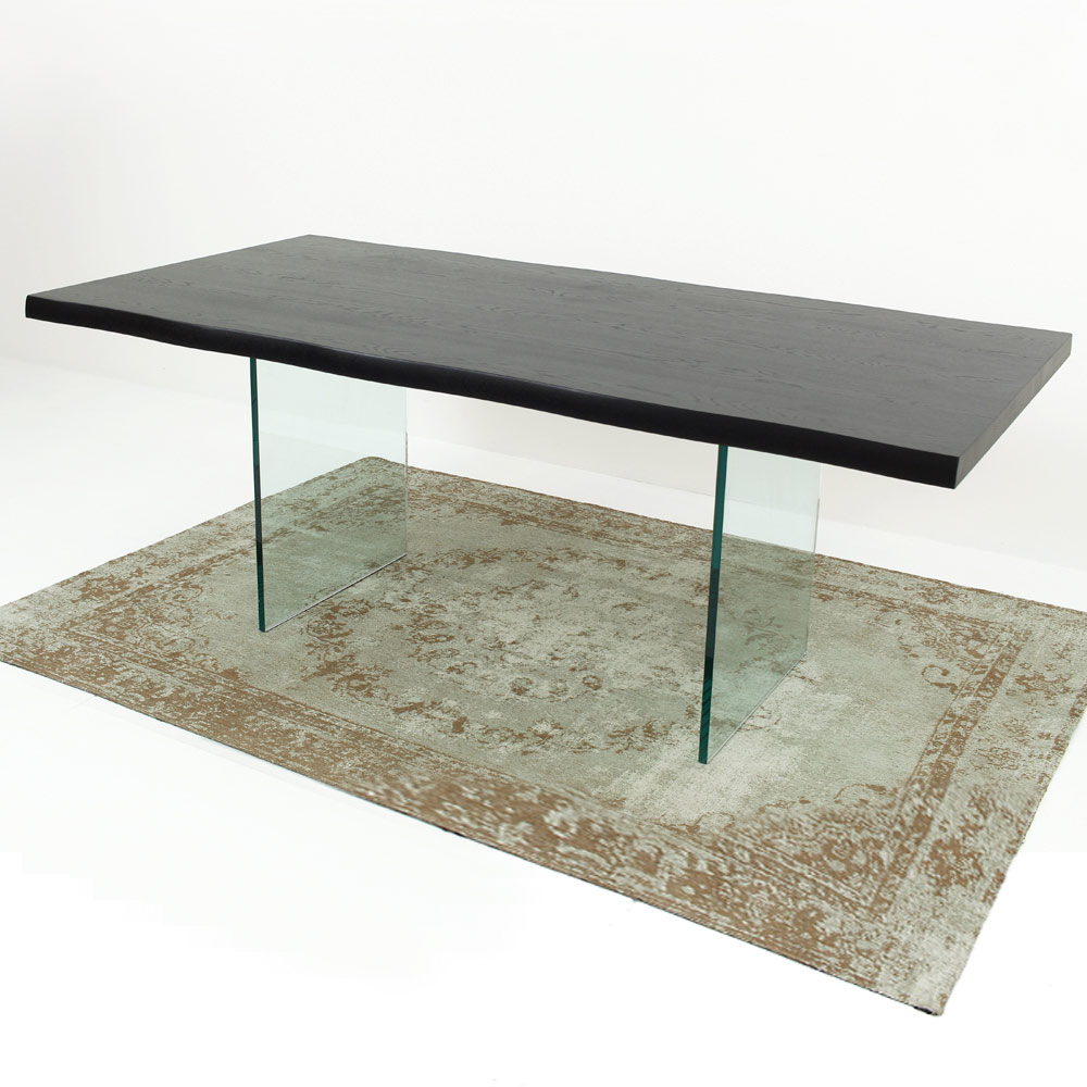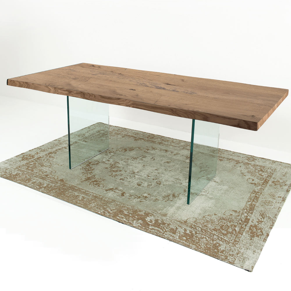 طاولة طعام حديثة مع سطح خشبي مكسو وقاعدة زجاجية شفافة مصنوعة في إيطاليا.