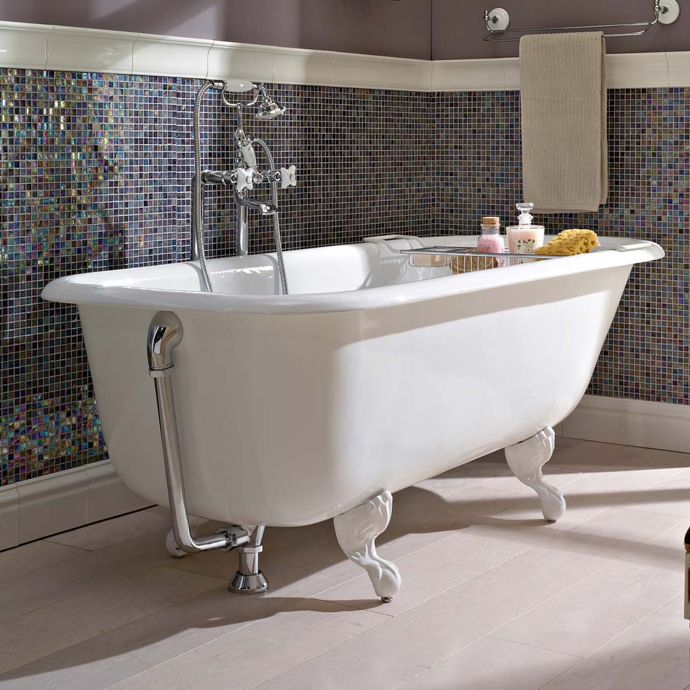 حوض استحمام قائم بذاته عتيق من الحديد الزهر مع أقدام، لون أبيض، صنع في إيطاليا مروة.