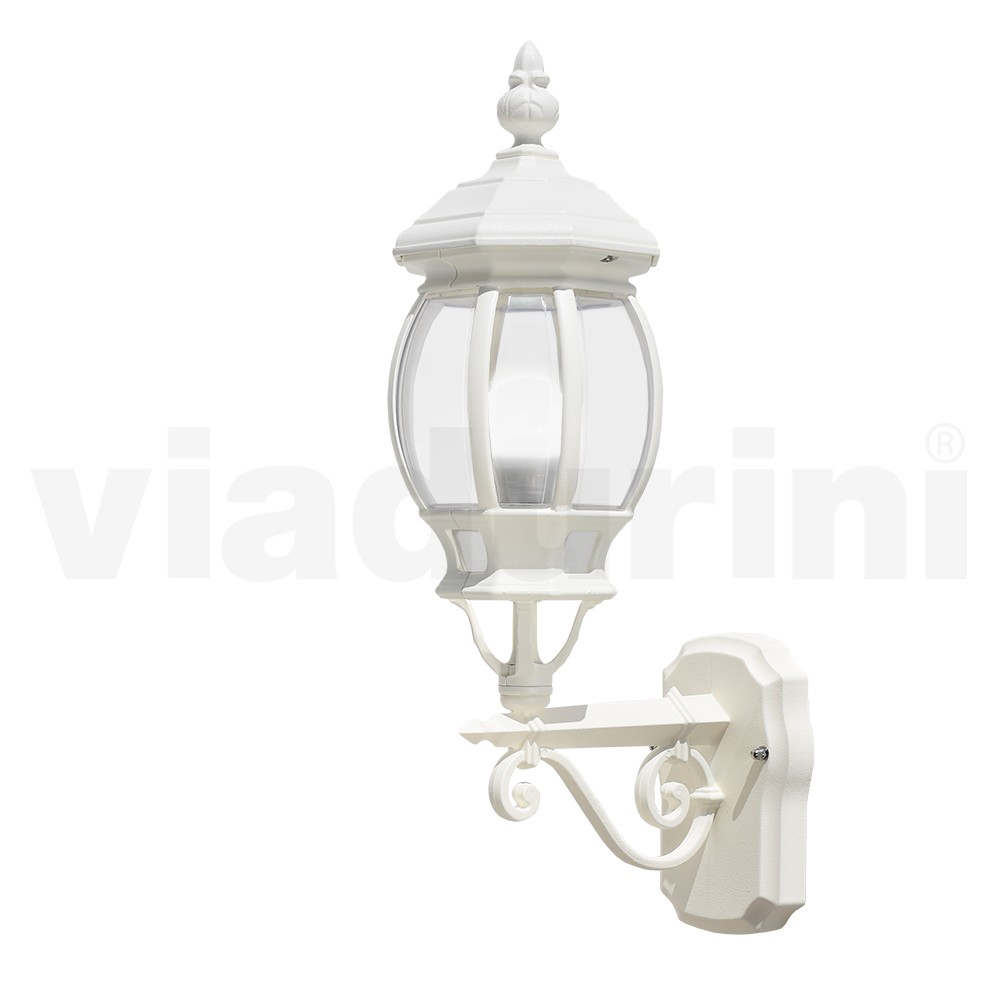 مصباح جداري خارجي ، مصنوع بالكامل في إيطاليا ، بهيكل من الألومنيوم المصبوب وموزع شفاف من البولي كربونات . مزود ببراغي من الفولاذ المقاوم للصدأ. يتميز بتصميم عتيق يُثري جماله بفضل التفاصيل الرائعة التي تجعل كل عنصر من عناصر المصباح أنيقًا وراقيًا . مثالي للمساحات الخارجية كالشوارع والشرفات والممرات، وكذلك للمساحات المنزلية كالحدائق والبيئات التجارية كالحانات والمطاعم.