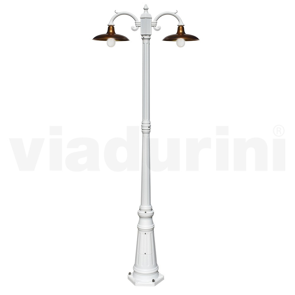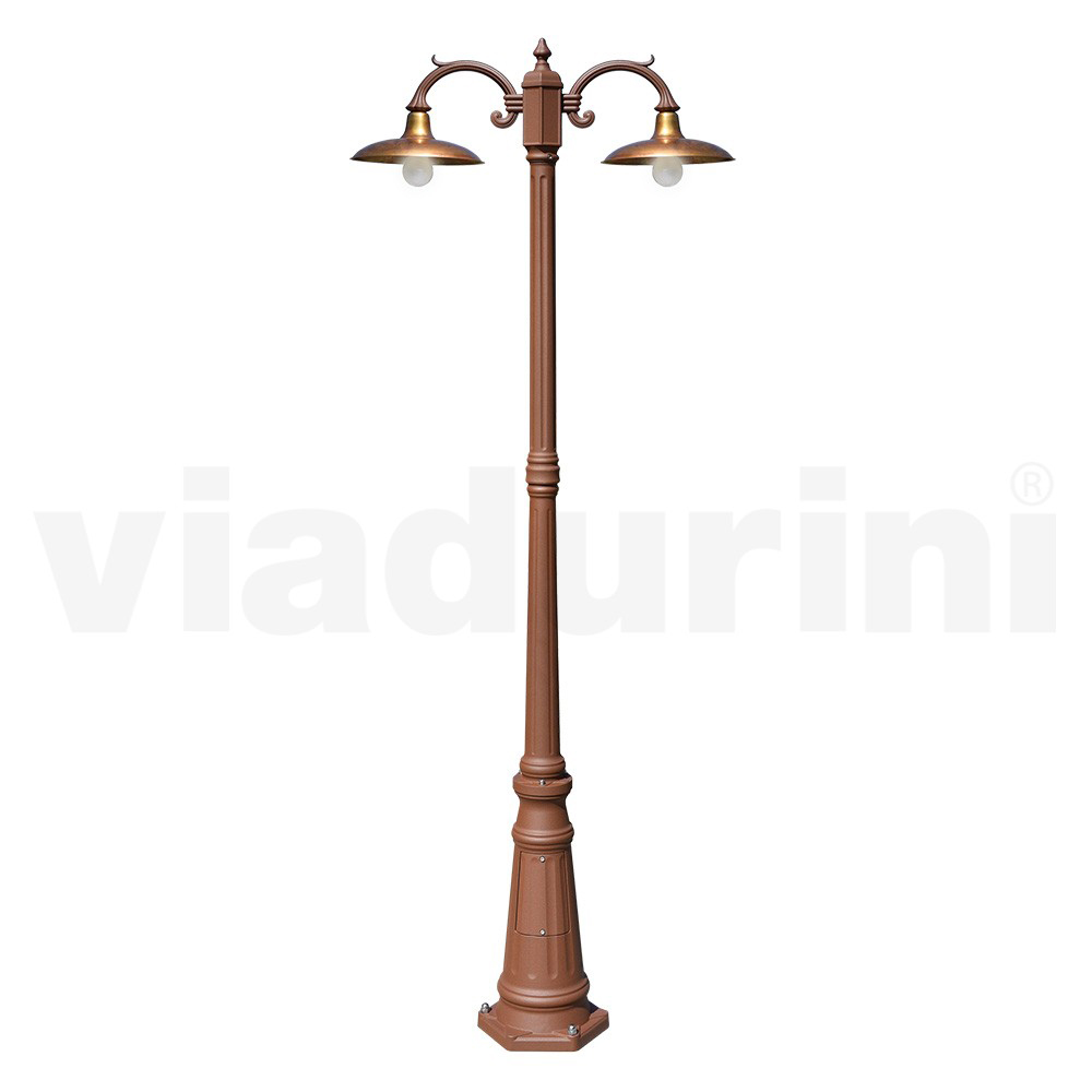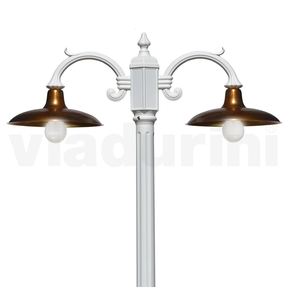 مصباح شارع من الألومنيوم على الطراز القديم مزود بمصباحين مع موزع نحاسي صنع في إيطاليا.
