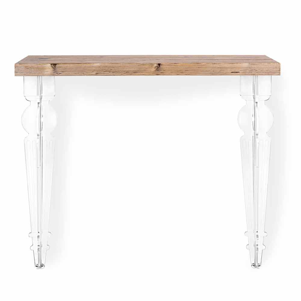 تتحد الأرجل المخروطية المصنوعة من زجاج PMMA الشفاف من البوليمر البكر، والذي يضمن سطوعه وبريقه بمرور الوقت، مع جوهر الخشب الفاخر في الجزء العلوي، مع لمسة نهائية مصقولة غير لامعة طبيعية.