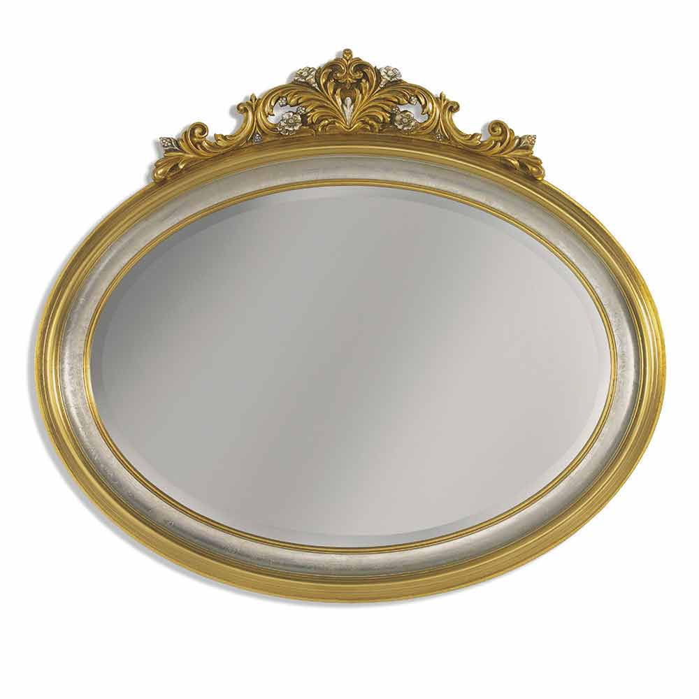 تصميمها الملكيّ يعلوه زخرفةٌ متقنةٌ تُتوّج المرآة، مُضفيةً لمسةً بصريةً آسرةً وشعورًا بالارتفاع والفخامة على الجدار المُعلّق عليه. يُضفي الشكل البيضاويّ للسطح العاكس منظرًا ناعمًا ومُرحّبًا، مثاليًّا للمساحات التي تُضفي عليها لمسةً من الألفة والرقيّ.