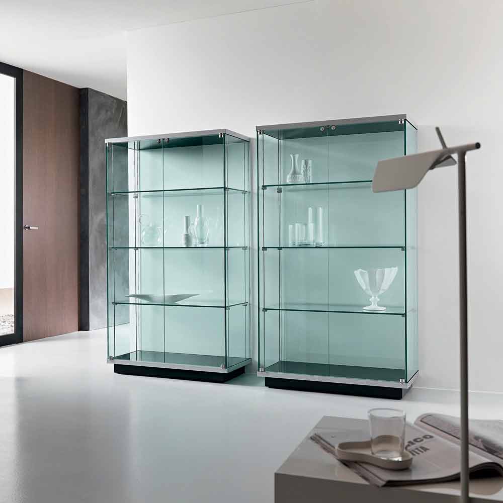 خزانة العرض ذات البابين والقفل مصنوعة بالكامل من زجاج مقسّى شفاف مع ثلاثة أرفف مع قاعدة وأعلى وقاعدة من الخشب المطلي باللون الأسود.