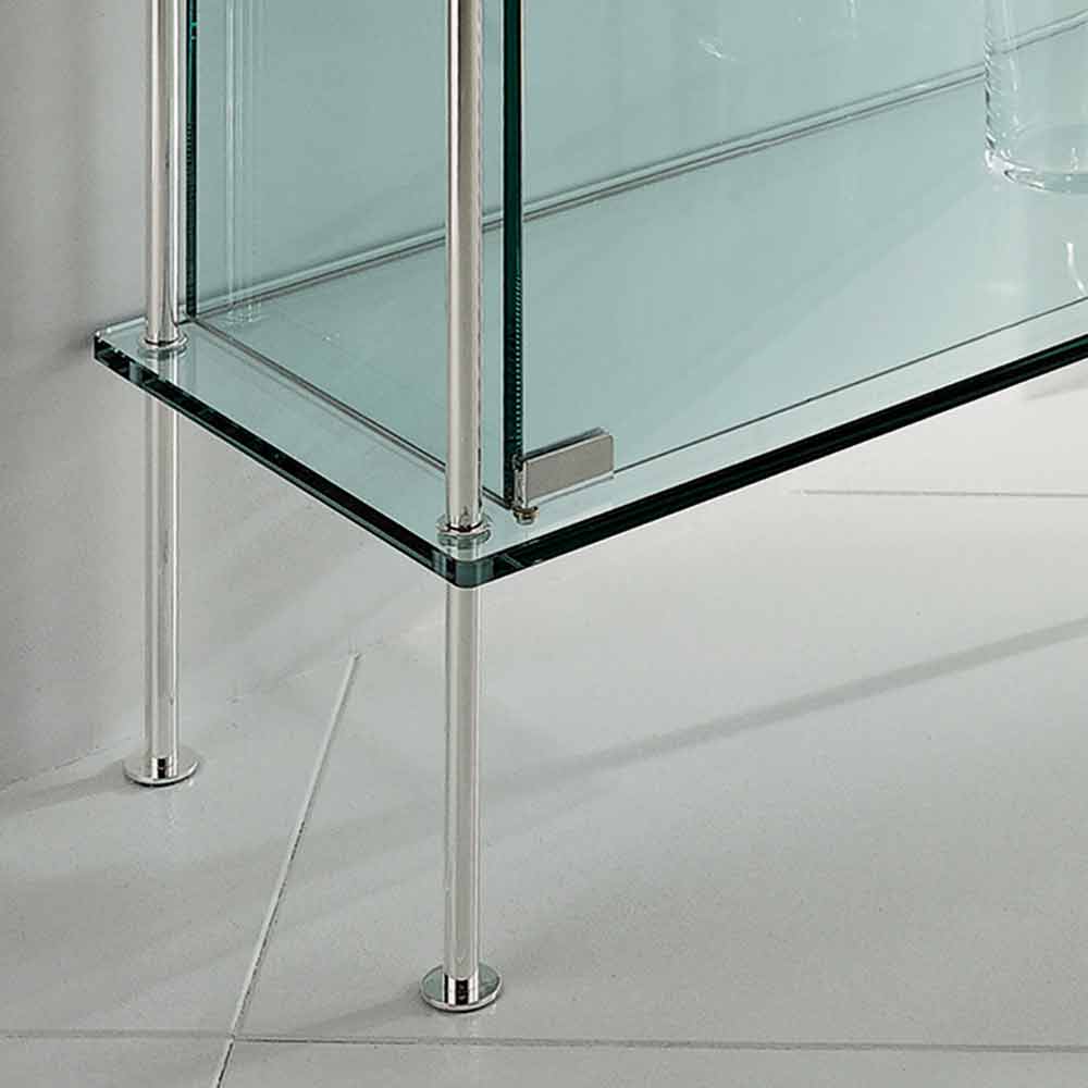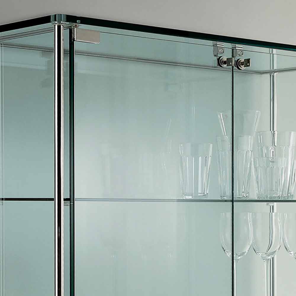 خزانة العرض ذات البابين مصنوعة بالكامل من زجاج مقسّى شفاف مع إغلاق ودعامات معدنية من الفولاذ المقاوم للصدأ.