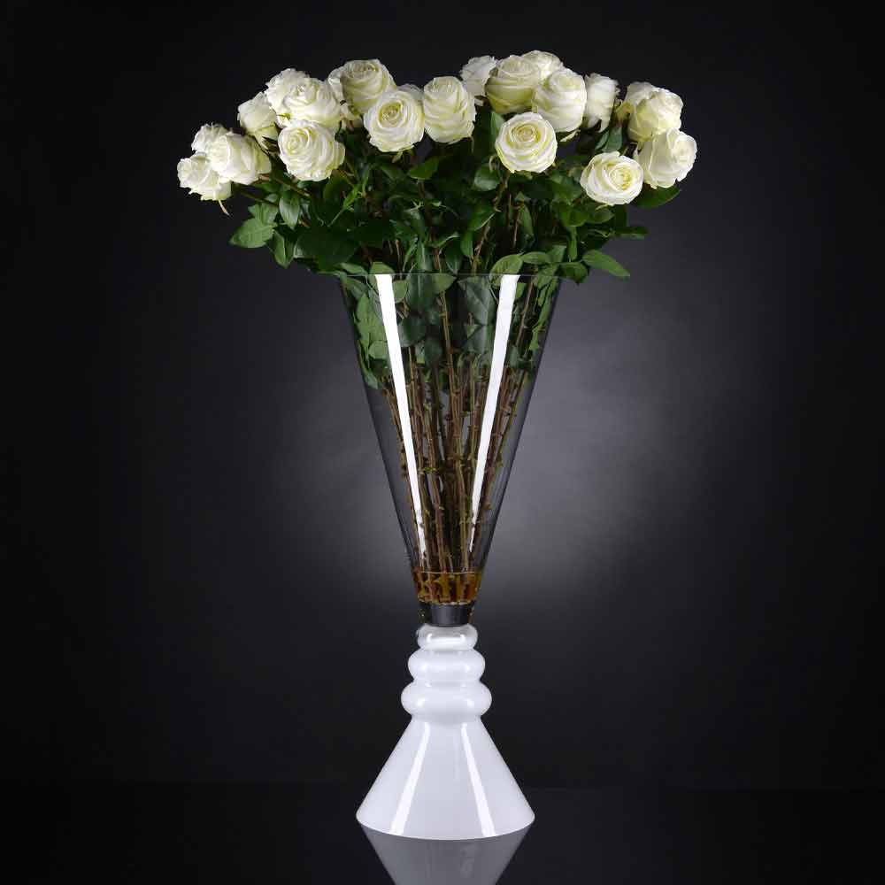 مزهرية داخلية من الزجاج الشفاف بقاعدة بيضاء،مصنوعة بالكامل في إيطاليا . تتميز بتصميم بسيط وأنيق، مع لمسة نهائيةأنيقة ومتعددة الاستخدامات، مما يجعلها مثالية لأي بيئة بأسلوب راقي . تصميم مثالي لمختلف البيئات، من أثاث المنزل إلى الفنادق والمطاعم ومناطق التعاقد والمنتجعات الصحية، بالإضافة إلى أماكن لإقامة الفعاليات وحفلات الزفاف.